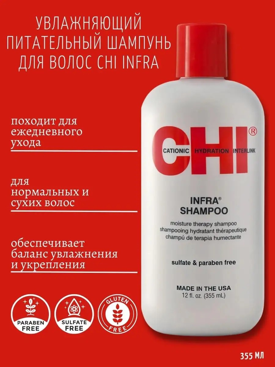 Увлажняющий и питательный **шампунь CHI Infra** для волос походит для ежедневного ухода за нормальными и склонными к сухости волосами, а также за волосами, подвергавшимися осветлению или другим химическим процедурам. Глубоко очищает волосы, обеспечивает баланс увлажнения и укрепления, благодаря высокому содержанию шёлка богатому комплексу витаминов для волос.**Шампунь Чи Инфра** очень мягко воздействует на волос, бережно смывая загрязнения, способствует максимальному очищению и увлажнению волос.