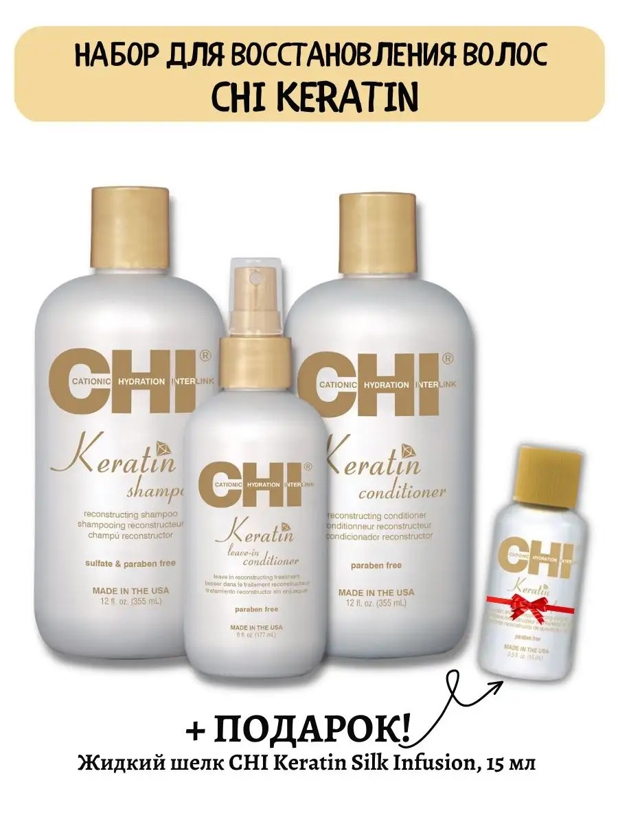 | Package contents | CHI Keratin Restorative Shampoo, 355 ml; CHI Keratin Restorative Conditioner, 355 ml; CHI Keratin Leave-in Hydrating Conditioner, 177 ml; + GIFT!!! Liquid Silk CHI Keratin Silk Infusion, 15 ml |