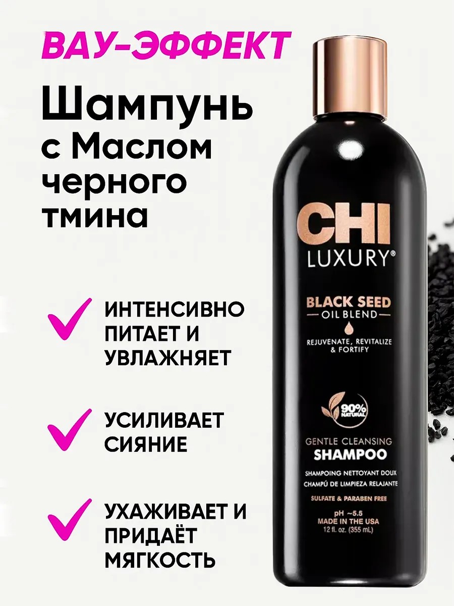 | Комплектация | CHI LUXURY Back Seed Oil Shampoo Восстанавливающий шампунь с маслом черного тмина 355 мл |