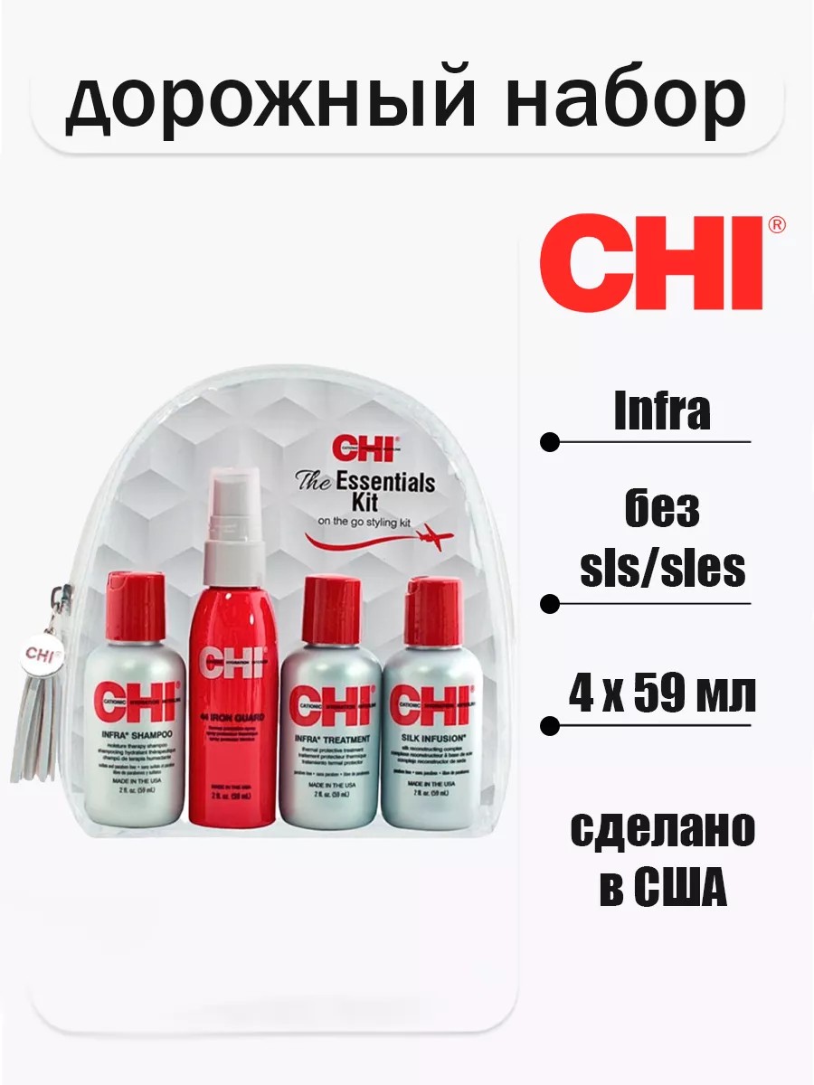 Набор из четырех средств для ухода за волосами Chi Infra в специальных мини-объемах для комфортного использования в путешествиях.