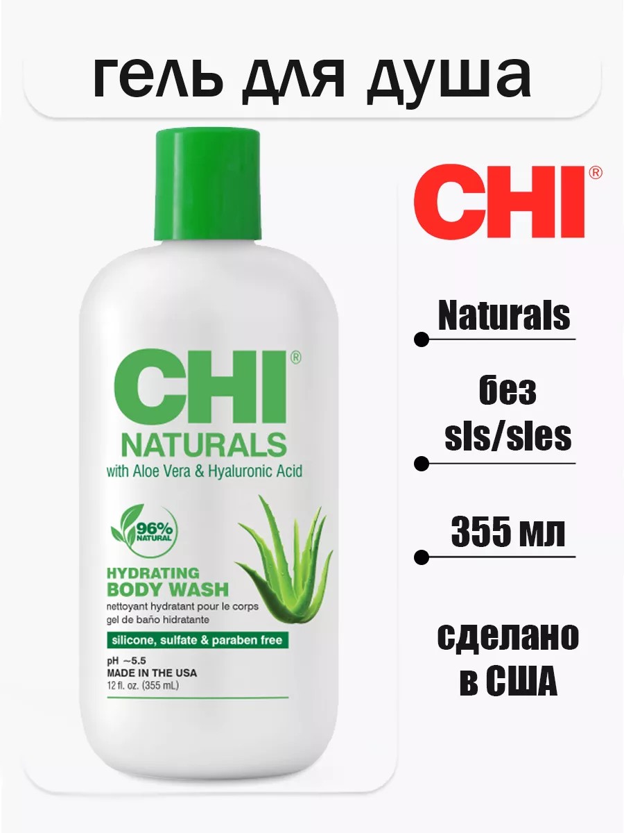 CHI Naturals with Aloe Vera Hydrating Body Wash Moisturizing Shower Gel with Aloe Vera and Hyaluronic Acid 355ml. CHI Naturals with Aloe Vera Hydrating Body Wash is a luxurious, rich, hydrating shower gel that gently cleanses and hydrates skin. Directions: Apply a small amount to a damp sponge and massage in circular motions to lather. Rinse.