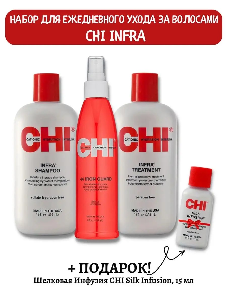 | Комплектация | Увлажняющий питательный шампунь для волос CHI Infra Shampoo, 355 мл; Кондиционер для волос CHI Infra Treatment, 350 мл; Спрей-термозащита 44 Iron Guard Thermal Protection, 237 мл; + ПОДАРОК! Шелковая Инфузия CHI Silk Infusion, 15 мл |