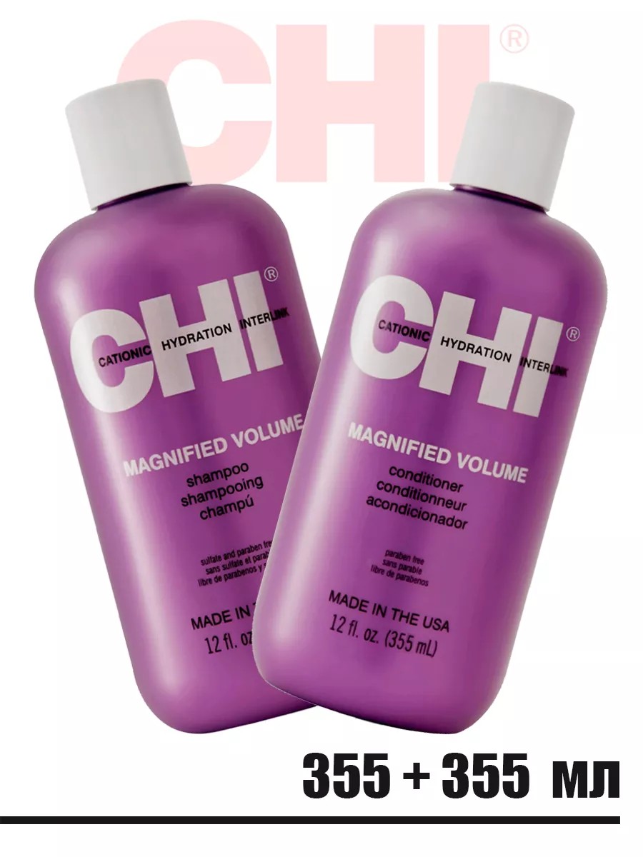 Набор CHI MAGNIFIED VOLUME Кондиционер 355мл + Шампунь 355мл/для придания объема волосам. Кондиционер: Предназначен для придания максимального объёма тонким и недостаточно густым волосам.Обеспечивает насыщение волоса протеинами и керамикой CHI44, повышение плотности и упругости стержня волоса.В основе действия системы: керамика CHI44 - сплав 44-х неорганических элементов, созданный компанией Farouk Systems, совместно с экспертами NASA. На сегодняшний день - это одни из самых совершенных и экологичных материалов, созданных человеком. Обеспечивает глубокое проникновение в волос протеинов и максимально укрепляет волосы.- Шампунь:Шампунь для придания объема волосам мягко очищает и увлажняет волосы, разглаживает кутикулу. Придает невероятный объем волосам, придавая ухоженный вид и благородное сияние. Подходит для всех типов волос.