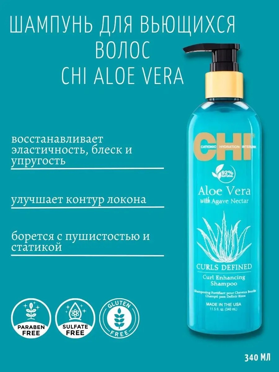 **CHI Шампунь для вьющихся волос,** содержит питательный комплекс из Нектара Агавы и Алоэ Вера, для восстановления эластичности, блеска и упругости. Шампунь для вьющихся волос CHI Aloe Vera Curl Enhancing Shampoo мягко очищает, смягчает и делает гладкой структуру вьющихся волос, борется с пушистостью и статикой, присущей вьющимся волосам. Смесь гидролизированного шелка, керамики CHI, комплекса витаминов для волос и растительного протеина укрепляет и защищает вьющиеся волосы.