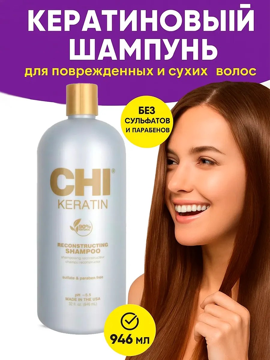 CHI KERATIN Shampoo — это восстанавливающий шампунь, разработанный для глубокого ухода за поврежденными и сухими волосами. Формула шампуня, обогащенная кератином, деликатно воздействует на волосы, восстанавливая их структуру и возвращая им силу и блеск. Шампунь CHI Кератин объемом 946 мл обеспечивает бережное очищение, удаляя загрязнения и остатки стайлинговых средств без пересушивания. Благодаря своей реконструирующей формуле, шампунь CHI KERATIN идеально подходит для всех типов волос, в том числе для непослушных и окрашенных. Он помогает сохранить яркость цвета и защищает волосы от негативного воздействия внешних факторов. Шампунь CHI KERATIN — это идеальное решение для тех, кто ищет профессиональный уход за волосами в домашних условиях. Его регулярное использование вернет вашим волосам здоровье, мягкость и сияние.