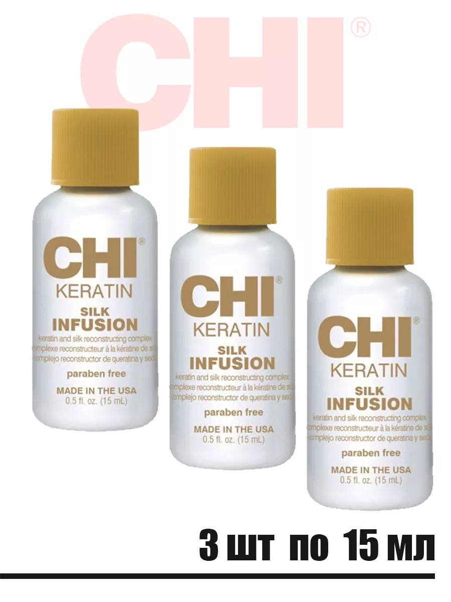 CHI KERATIN Восстанавливающая сыворотка для волос (шелк с кератином) 15мл (3 флакона). Сухие, поврежденные и истощенные волосы не имеют той природной красоты, которая была в них заложена. CHI представляет инновационное средство на основе натурального шелка Keratin Silk Infusion, которое быстро возродит и преобразит ваши волосы до неузнаваемости. Эффект: Глубоко увлажняет и питает активными веществами. Исцеляет волосы после окрашивания, обесцвечивания, применения химических веществ и высоких температур. Укрепляет волосы от корней до кончиков. Поддерживает волосы в здоровом увлажненном состоянии, устраняя их чрезмерную сухость, ломкость и небрежный вид. Придает ослепительный блеск и защищает от дальнейших повреждений. Применение. Наносить на сухие или слегка влажные волосы, особое внимание уделяя кончикам. Подходит для ежедневного применения.