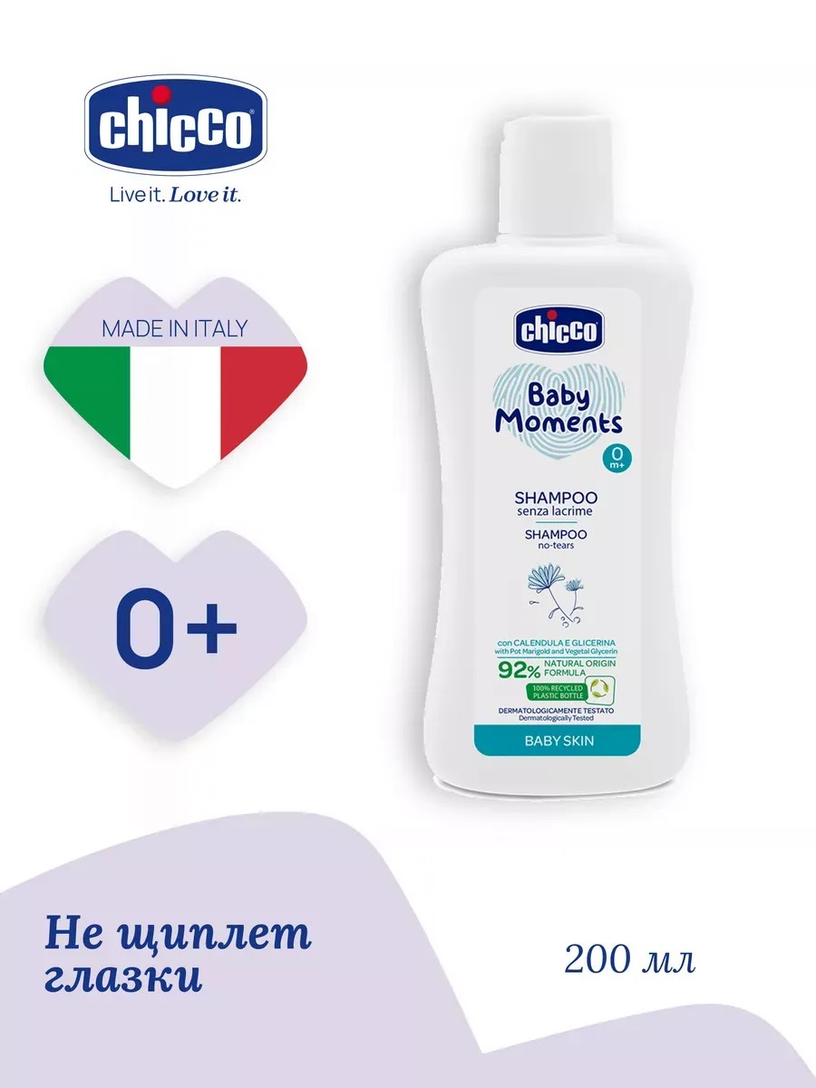 Детский увлажняющий шампунь для волос с экстрактом календулы идеально подходит для детей с рождения, малышей постарше и для всей семьи. Входящий в состав экстракт календулы обладает успокаивающим и противовоспалительными свойствами. Формула "без слез" не раздражает глазки и не вызывает покраснение. Мягкий детский шампунь для новорожденных прошло клинические испытания и не содержит спирт, красителей, парабенов. Упаковка средства для купания на 100% состоит из переработанного пищевого пластика и пригодна к повторной переработке. Косметика Chicco Baby Moments создана обеспечить бережный, безопасный уход за малышом с самого рождения. Шампунь детский Chicco Baby Moments производится в Италии, не содержит парабенов, лаурил- и лауретсульфатов натрия (SLS/SLES), содержит увлажняющие растительные ингредиенты, клинически протестирован для чувствительной кожи и является гипоаллергенный для мам и малышей.