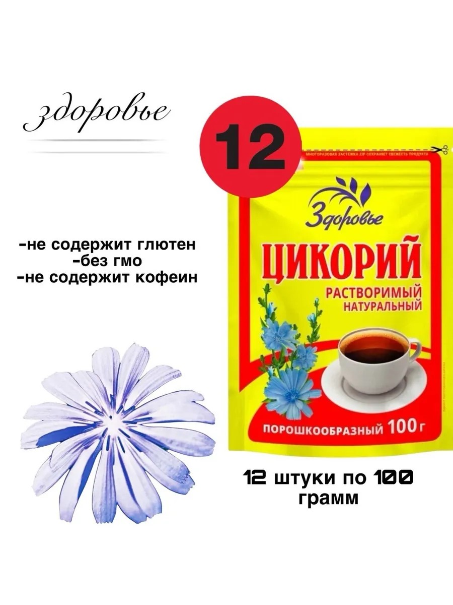 Цикорий Здоровье - это натуральный растворимый напиток, который производится в России и соответствует стандартам ГОСТ 55512-2013. В упаковке содержится 12 пакетиков по 100 грамм каждый, что делает его удобным для использования в домашних условиях.