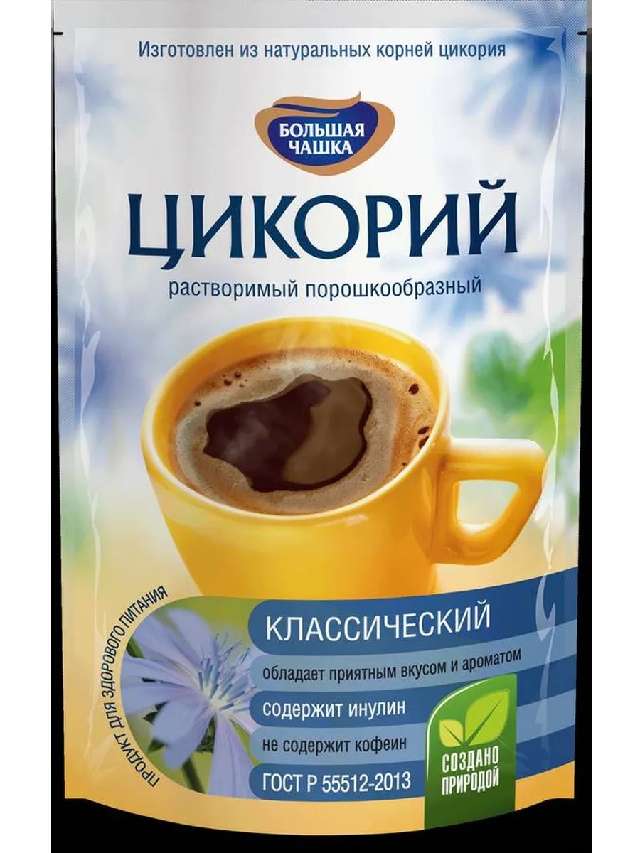 Цикорий растворимый БОЛЬШАЯ ЧАШКА натуральный порошкообразный классический – настоящий кладезь полезных элементов. Превосходный вкус напитка с легкой приятной горчинкой достигается благодаря ультрасовременным технологиям производства, которые позволяют сохранить все ценные качества, присущие природному цикорию. Наслаждайтесь приятным и ароматным напитком в любое время суток.