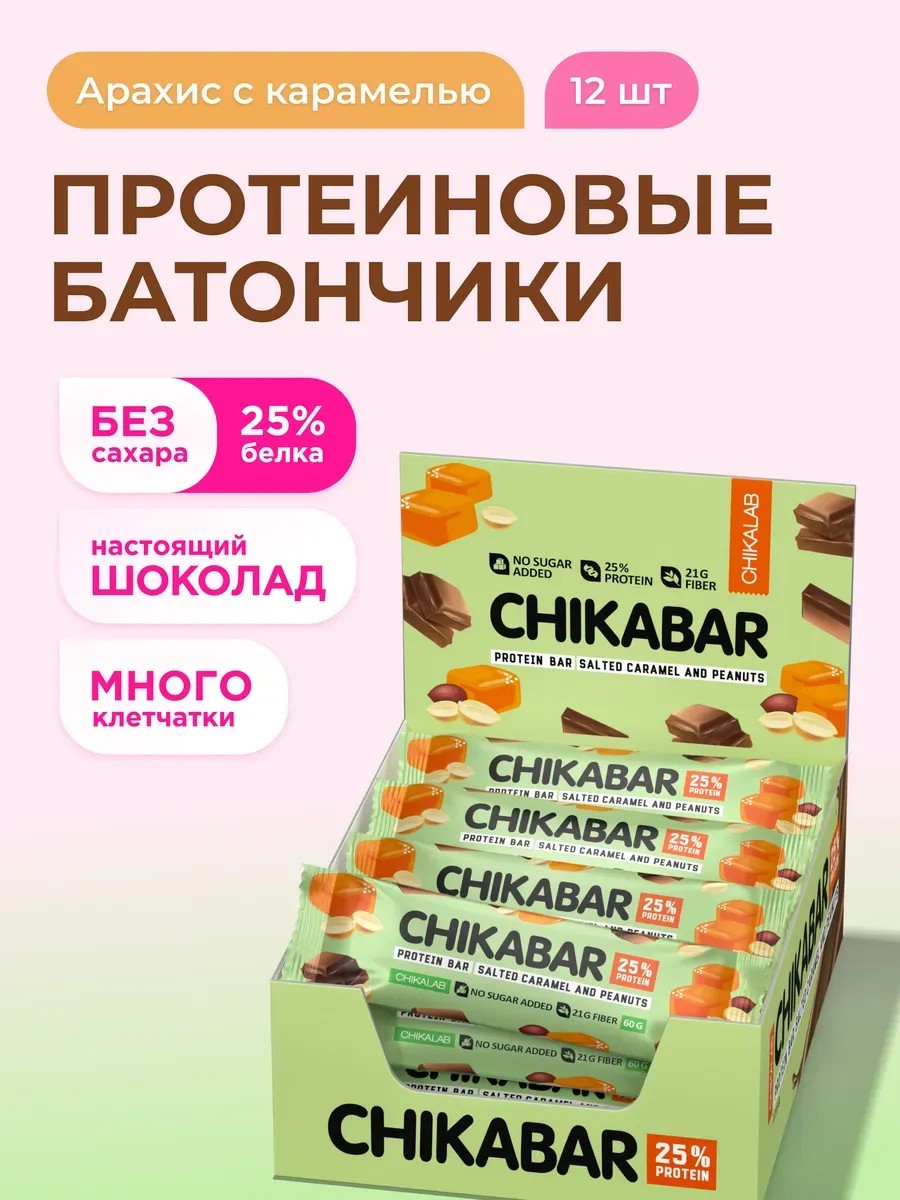 Протеиновые батончики Chikabar Aрахис Кaрамель, 12шт х 60г