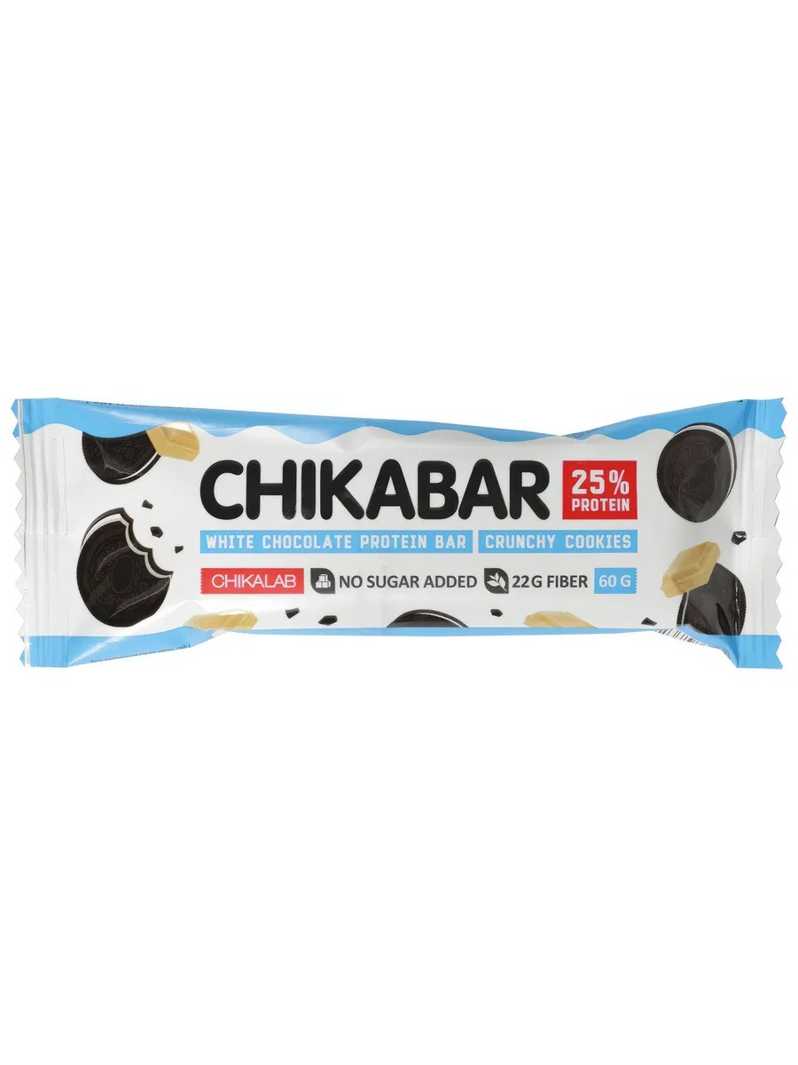 The Chikalab Cookies and Cream Protein Bar, 60g, is a delicious and healthy treat that you can incorporate into your daily diet without worrying about your figure. It's easy to take to work, on a walk, or after an intense workout to replenish your strength and energy. The crunchy cookie and delicate chocolate coating will satisfy any sweet tooth. This bar pairs deliciously with black tea, coffee, or sports shakes. Natural sweeteners provide a pleasant taste, while cashews impart a rich, nutty flavor. One serving contains 15g of protein and 22g of dietary fiber. These factors stimulate muscle development, improve digestion, and boost immunity.