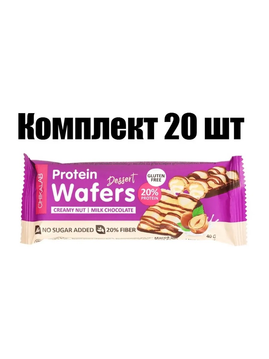 CHIKALAB Glazed Wafer Protein Bar with Creamy-Nut Dessert Flavor, 40g, 20 pcs. Chikalab Wafers with Creamy-Nut Dessert flavor are double-filled wafers. The product consists of eight crispy pillows filled with a creamy filling with crushed hazelnuts and natural milk chocolate. Made using a special technology without gluten and added sugar, the bar contains 8g of concentrated protein. Recommended use: the product is ready to eat; it can be eaten between meals, as a quick snack, and also used as an additional source of energy.