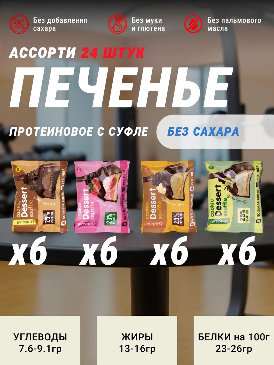 | Количество предметов в упаковке | Белковое протеиновое печенье с суфле бомбар 24шт |