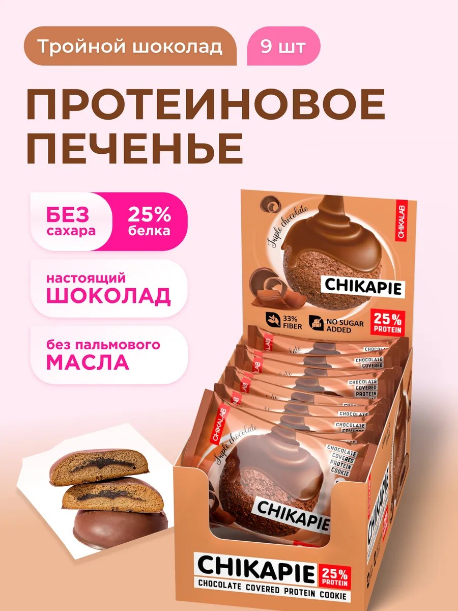 Протеиновое печенье CHIKAPIE, приготовленное без муки и сахара, с нежной сливочной начинкой внутри, покрытое молочным шоколадом - не просто десерт, а полноценный высокобелковый перекус для поддержания формы.