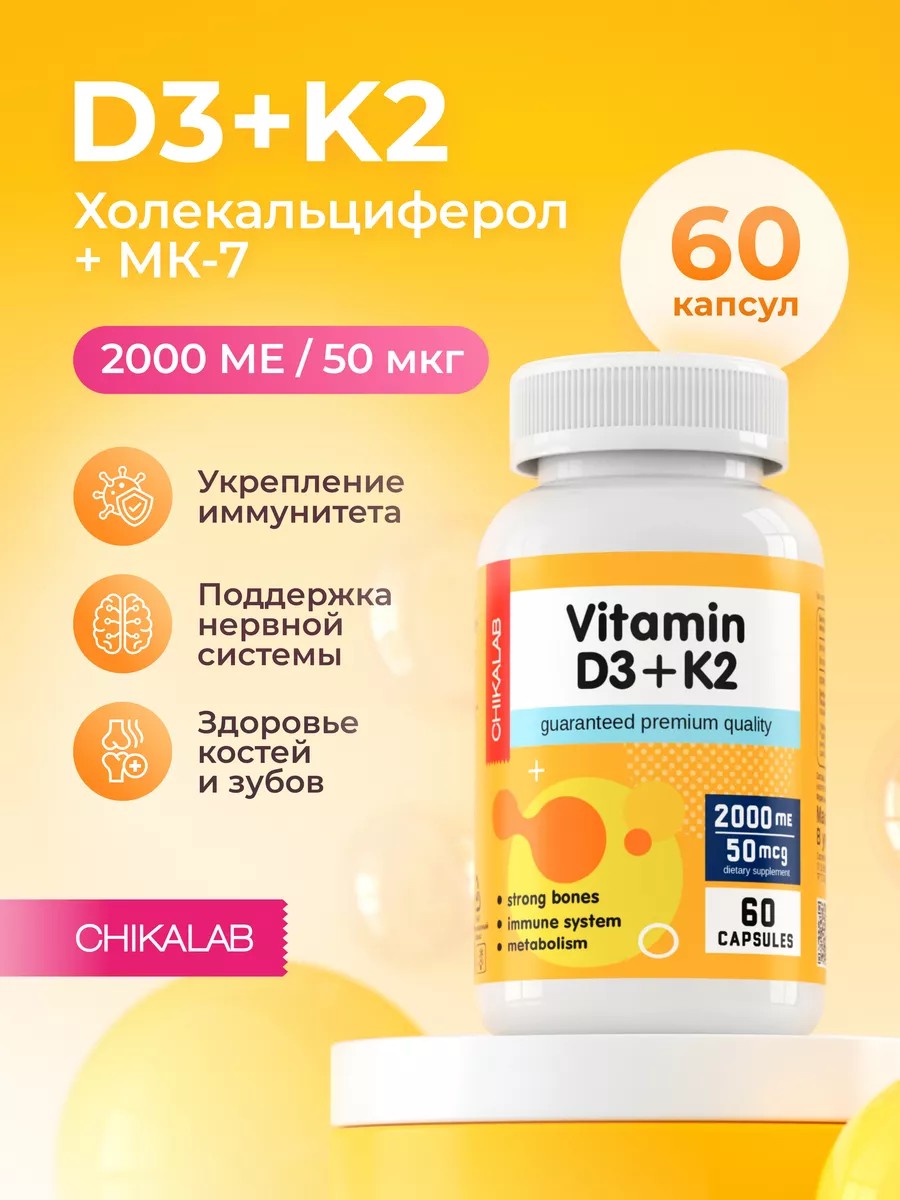 Витамин д3 и к2 от CHIKALAB. Солнечный витамин D3 - обладает большим спектром действий для поддержания здоровья и красоты. Поддерживает метаболизм, регулирует обмен кальция и фосфора - минерализация костной ткани, развитие костей, связок опорно-двигательного аппарата, усвоение в кишечнике фосфора и кальция. Далее укрепляется и улучшается состояние волос, ногтей, кожного покрова и зубов. Усвоение углеводов и нормализация свертываемости крови. Укрепление иммунитета, борется с воспалительными процессами, борется с псориазом и экземами.