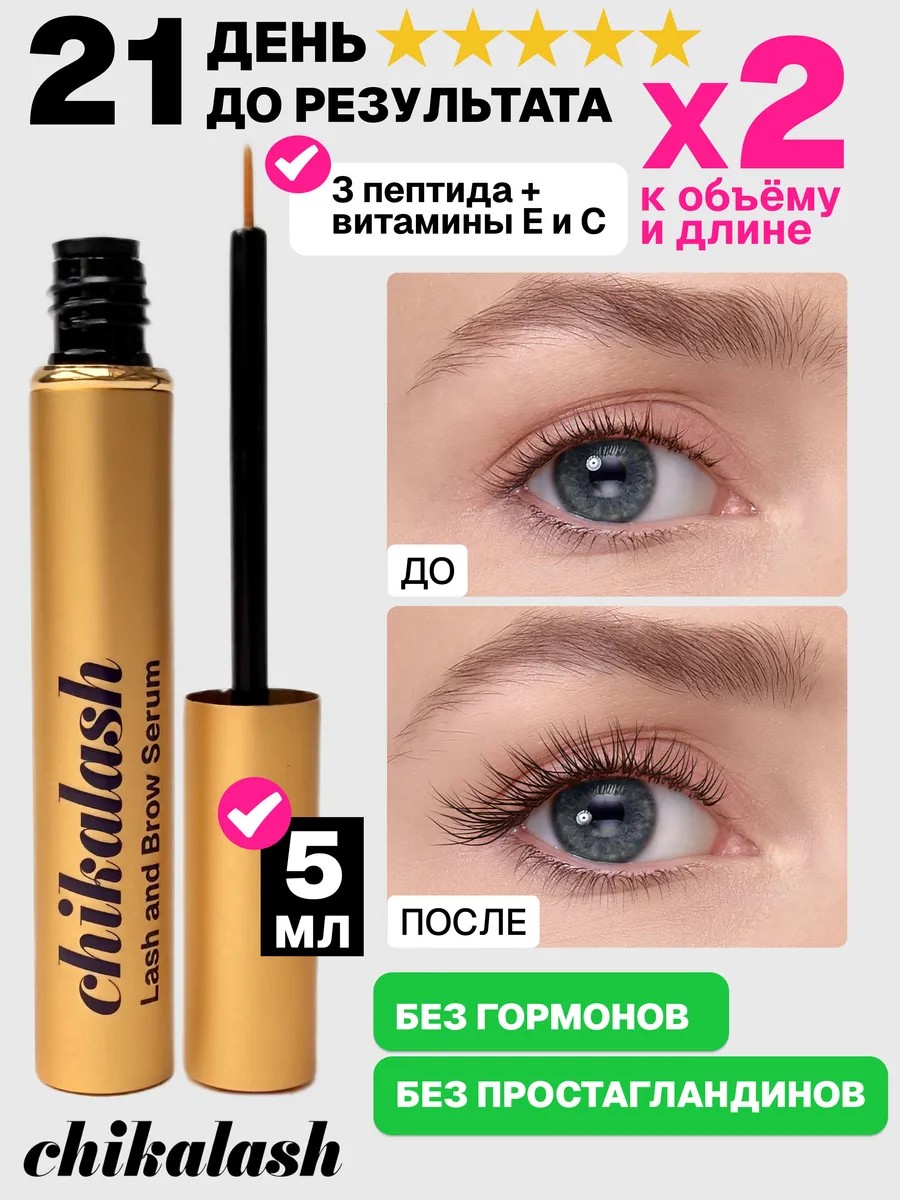 | Полное наименование товара | Сыворотка для роста ресниц и бровей Chikalash, без гормонов, натуральный состав, 5 мл. |
