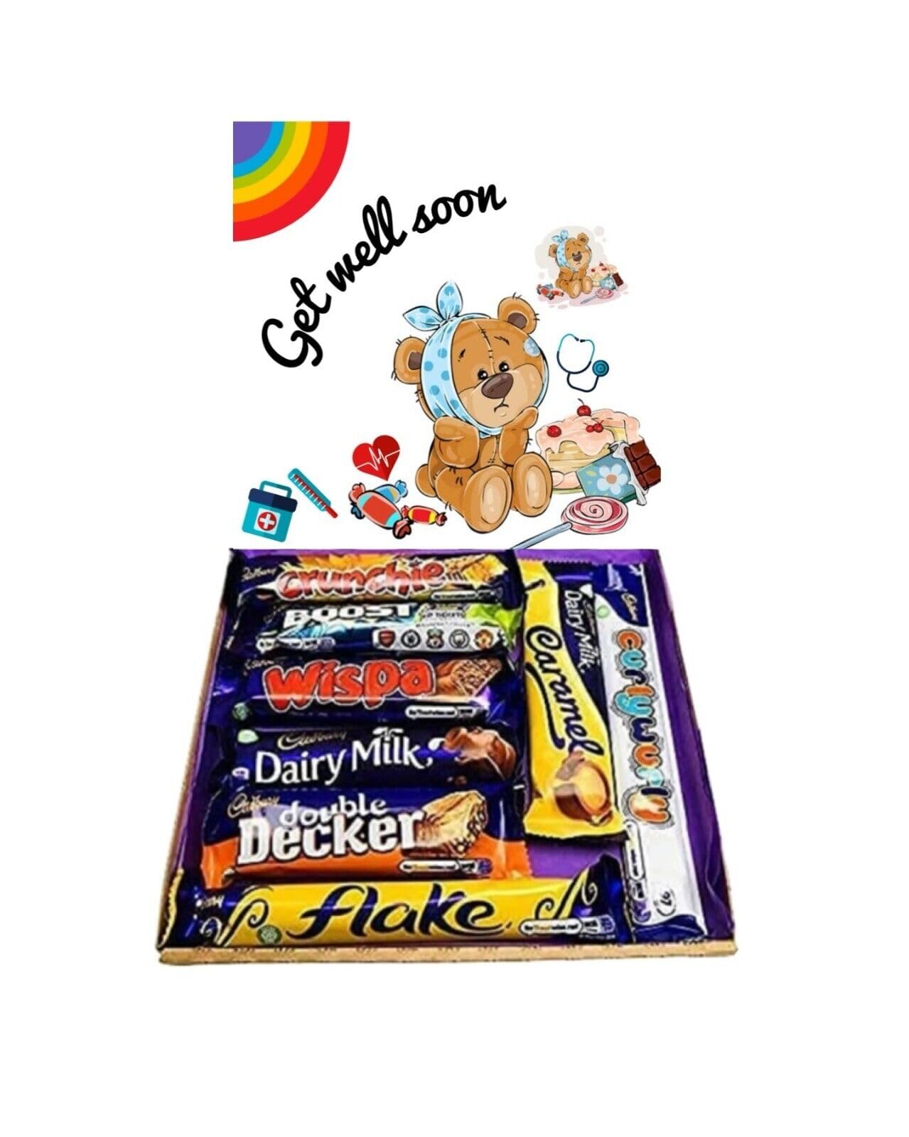 A hamper filled with delicious Cadbury's chocolate full size bars wrapped in tissue paper and tied with matching ribbon This makes the perfect Get Well Soon gift but please view our shop for any occasion :- Mothers Day, Fathers Day, Easter, Birthday, Christmas stocking filler, Secret Santa, Passing driving test, Quiz winner, Employee of the month, Well Done, Congratulations, Thank You, Get Well, Thinking Of You,Valentines Day, Movie Night, New Parents, Leaving Gift, New Job, A yummy treat for yourself or just to show your appreciation to your loved ones! An ideal letter box gift that can be sent directly to the chocolate loving recipient! The chocolates in this hamper are all FULL SIZE bars - no multipack sized bars! The gift box includes: 1 x Crunchie, 1 x Boost, 1 x Wispa, 1 x Dairy Milk, 1 x Double Decker, 1 x Flake, 1 x Caramel 1 x Curly Wurly (chocolate may slightly vary at times) These are handmade fresh to order The brown gift box measures approx 220mm x 190mm x 19mm This makes the perfect gift for a vegetarian !Can be sent directly to the recipient. Will be loved by all ages. Filled with 8 delicious Cadburys chocolate brs. The Ultimate treat for a chocolate lover. A little pick me up gift for a poorly child you may know !.