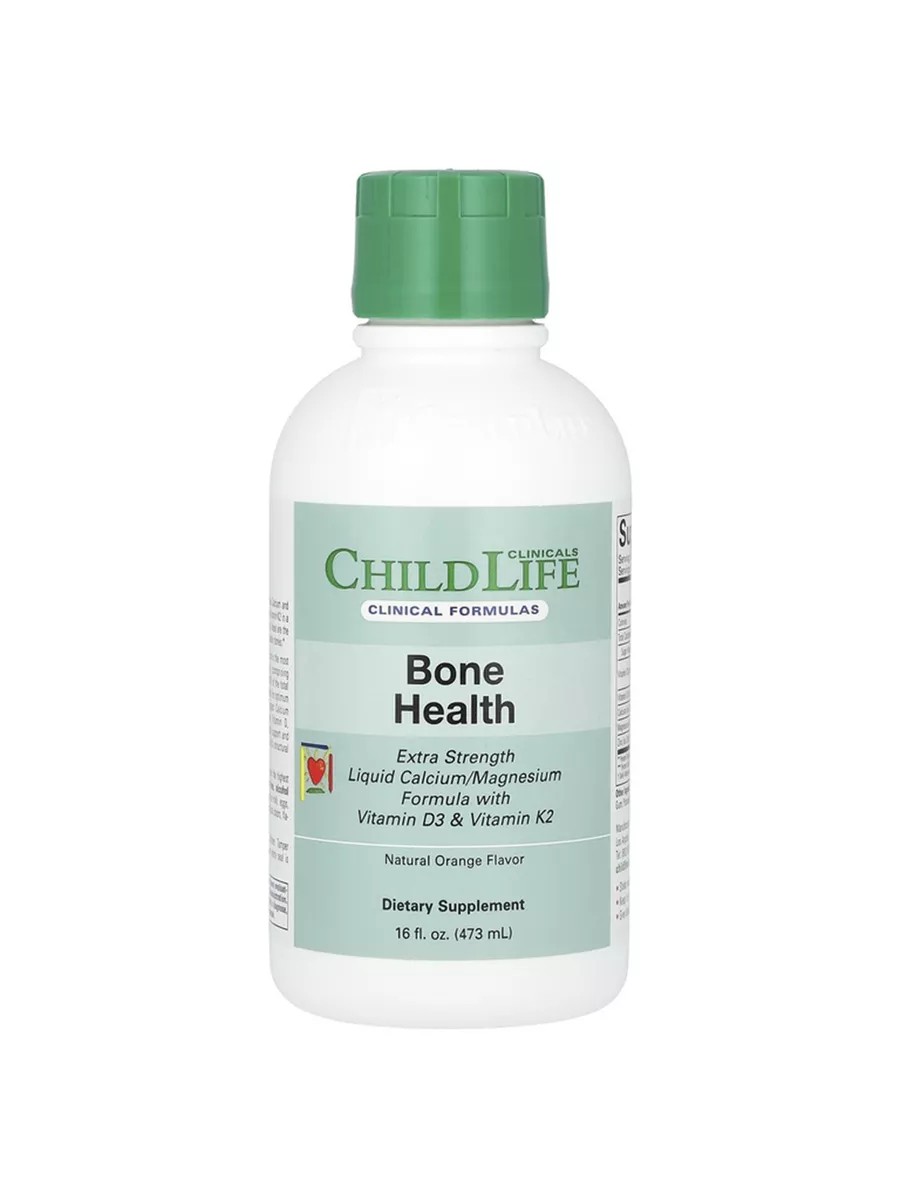 ChildLife Clinicals Bone Health supplement contains calcium and magnesium combined with vitamin D3 and vitamin K2 in a balanced, highly absorbable, great-tasting formula.
