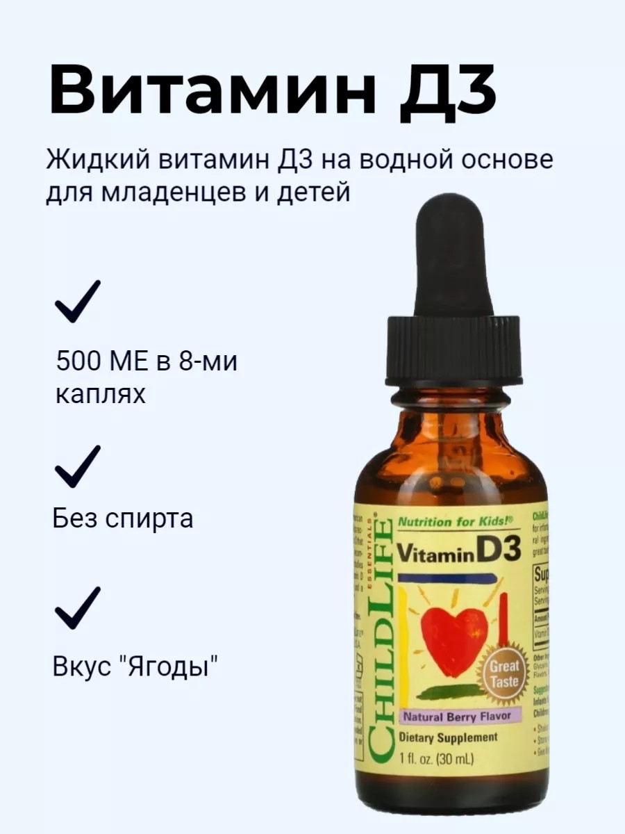Витамин D3 от ChildLife разработан специально для младенцев и детей. Не содержит спирта, из натуральных ингредиентов, хорошо усваивается и имеет превосходный вкус натуральных ягод.