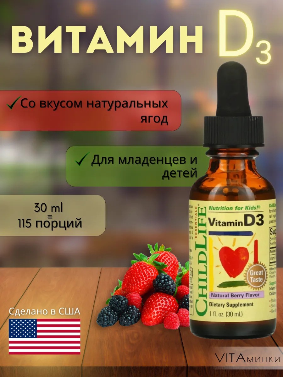 Child Life D3, Витамин Д3 разработан специально для младенцев и детей. Детский д3 не содержит спирта, из натуральных ингредиентов, хорошо усваивается и имеет превосходный вкус натуральных ягод.