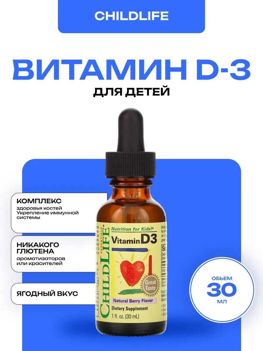 Детский витамин Д жидкий от ChildLife Essential - это биологически активная добавка, специально разработанная для детей, чтобы обеспечить им достаточное количество витамина D, особенно важного для здоровья растущего организма. Витамин D, или холекальциферол, является важным питательным веществом, которое играет ключевую роль в поддержании здоровья детей. Известно, что витамин Д способствует нормальному росту и развитию костей, помогает усваивать кальций и фосфор, и имеет положительное влияние на иммунную систему. Детский витамин Д жидкий представлен в форме капель, что облегчает его применение для детей. Эти капли содержат витамин Д3, наиболее активную и биологически доступную форму витамина Д. Они могут быть удобно добавлены в пищу или напитки, что облегчает дозировку и усвоение витамина. Витамин D жидкий предназначен для детей различного возраста, включая новорожденных и младенцев. Специальная форма жидкого витамина Д позволяет точно контролировать дозировку в соответствии с возрастом и потребностями ребенка. Детский витамин Д жидкий является безопасным и эффективным дополнением питания, разработанным с учетом потребностей детей. Он может использоваться для поддержания здоровья костей, силы иммунной системы и нормального роста и развития детей. Витамин D3 от ChildLife разработан специально для младенцев и детей. Не содержит спирта, из натуральных ингредиентов, хорошо усваивается и имеет превосходный вкус натуральных ягод. Младенцам с рождения до 1 года: 6 капель в день. Детям старше 1 года: 8 капель в день. Хорошо встряхните перед использованием.Можно давать в неразбавленном виде или смешать с любимым напитком ребенка.