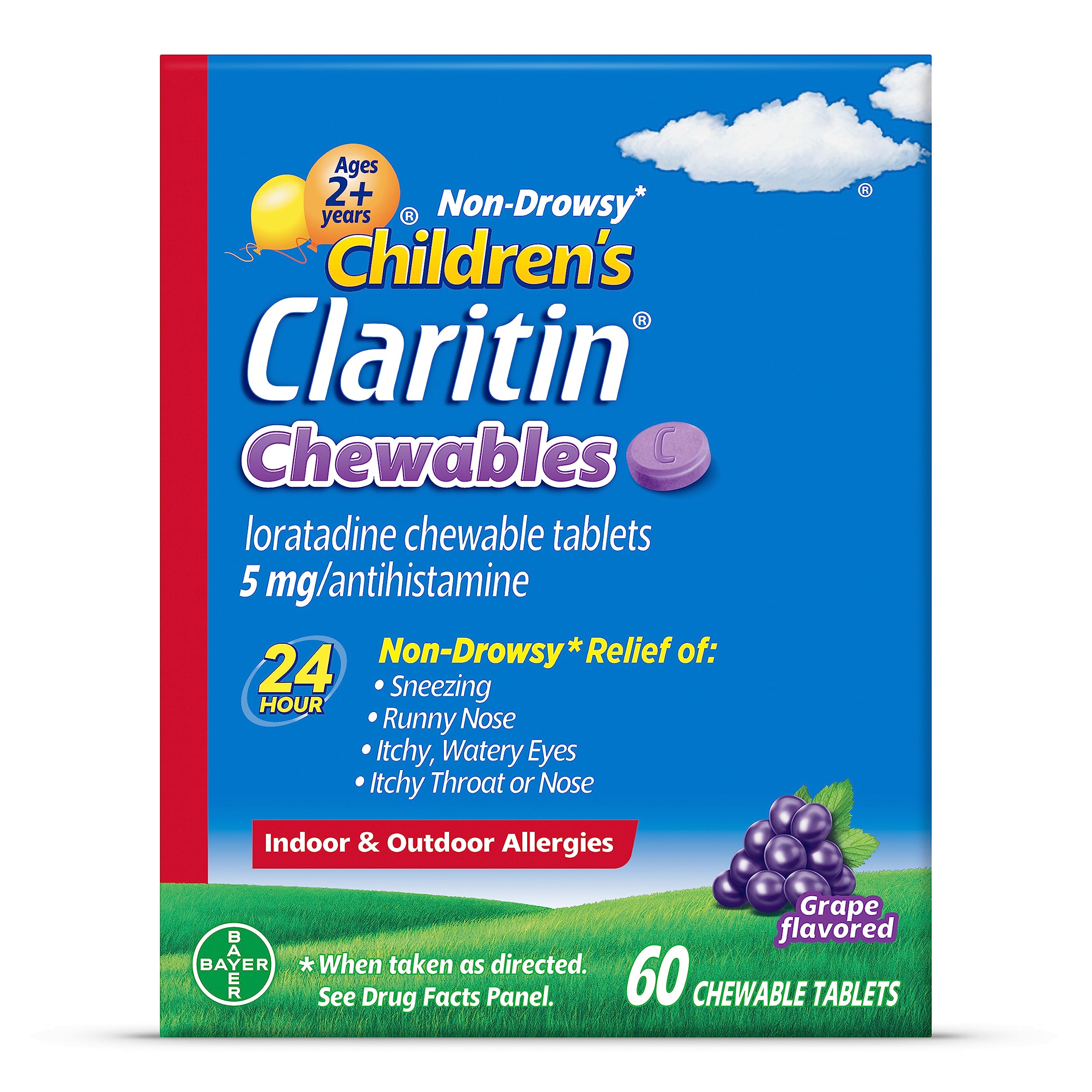 Children's Claritin Chewables Grape flavor provides non-drowsy allergy relief for kids in a convenient chewable tablet. With the active ingredient loratadine, a powerful antihistamine, these tablets provide relief from symptoms caused by allergies to pollen, dust, pets, and other common allergens. The grape flavor is a delicious option for kids and the chewable tablets are easy for parents to administer. Children's Claritin allergy medicine is the 1 pediatrician recommended non-drowsy oral allergy brand, and 98 of parents are satisfied with Children's Claritin.