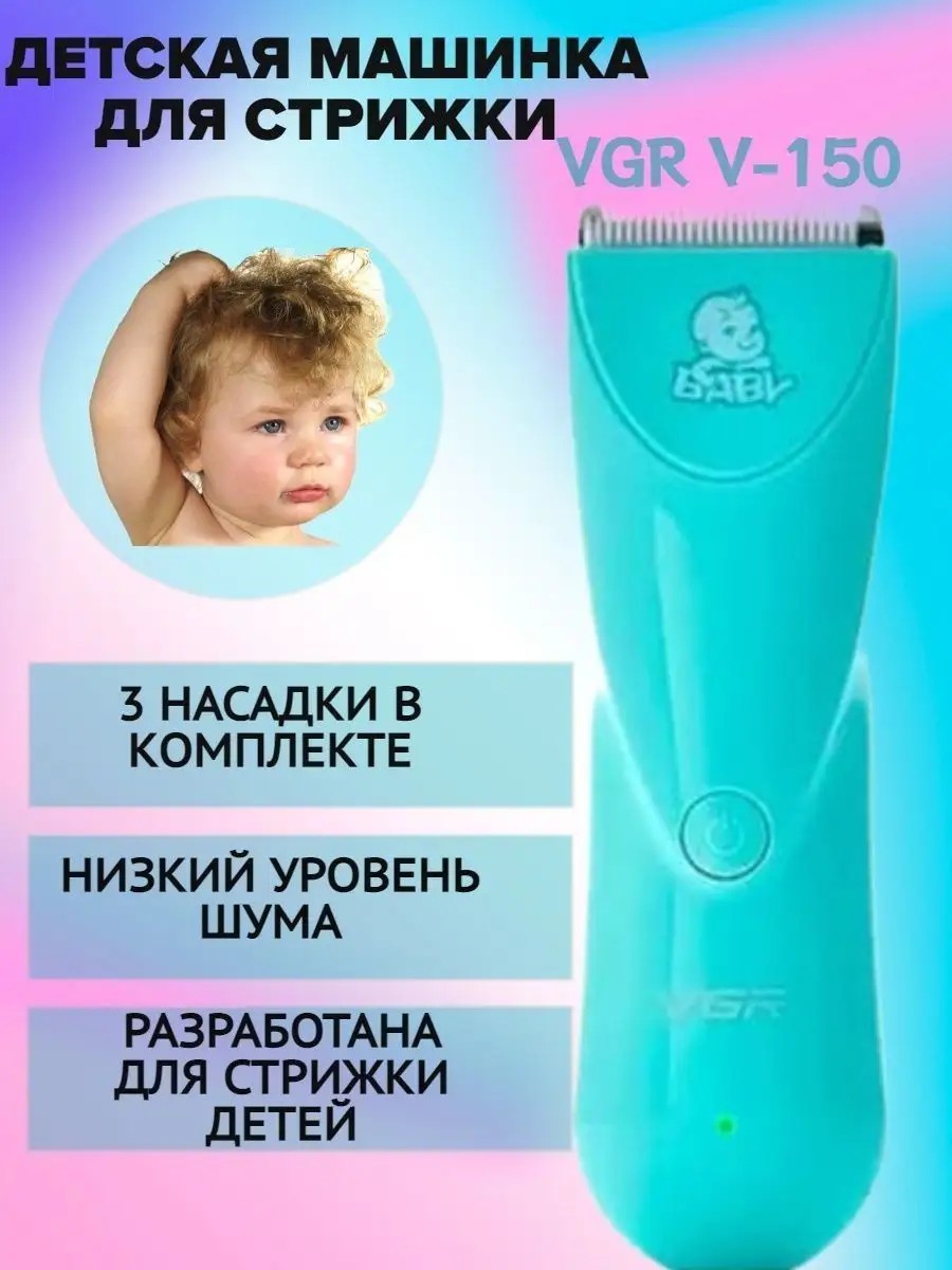 Машинка VGR-150 для стрижки детей от 0 лет с водостойким корпусом, встроенным аккумулятором и красивым дизайном. Керамические безопасные ножи - фиксированное расстояние между зубьями 1,2 мм. Низкий уровень вибрации и шума. Водонепроницаемый корпус. Лезвие можно мыть под струей воды, не снимая. Машинку можно использовать в беспроводном режиме Всего через 3 часа подзарядки, машинку можно беспрерывно использовать до 60 минут. Тип аккумулятора - Ni-Mh. Емкость аккумулятора - 800мА/ч.. Тип мотора - роторный. Мощность - 5Вт. Нож легко чиститься . Лезвие - нержавеющая сталь отличного качества, движущаяся часть ножа - керамика.brХарактеристикидвойные насадки в комплекте машинки для стрижки детских волос на длину от 3 до 12 ммБезопасный ножевой блок из нержавеющей стали с титановым покрытием и керамическими ножамиаккумулятора суммарным объемом 800 mAh для автономной работы 60 минутБыстрая зарядка от USB источников питания всего в течение 1,5 часаВлагостойкий корпус из легкого и прочного полимера ABSДолговечный механизм привода обеспечит работу машинки для стрижки на долгие годыЛегко чистится и не требует заточки - лезвия самозатачиваются в процессе работы. Машинка бережно и аккуратно выполняет свою задачу. В нашем комплекте есть все для стрижки ваших малышей.