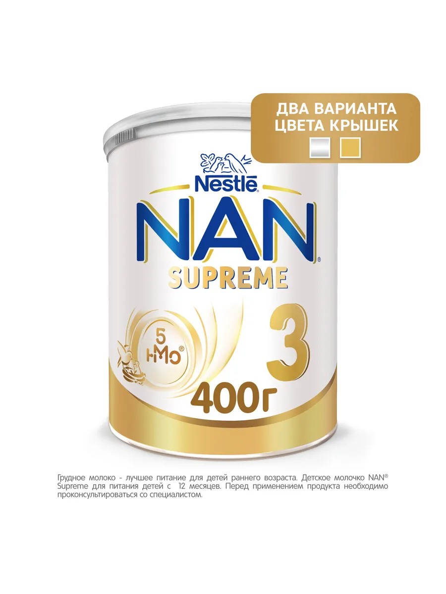 NAN 3 SUPREME. Infant milk with oligosaccharides for protection against infections, from 12 months. 400g. NAN 3 SUPREME is the only formula in Russia* with a complex of breast milk oligosaccharides** 2'FL + LNnT, which helps strengthen the immune system and protect against infections. NAN 3 SUPREME milk is specially formulated for children over 12 months old and combines the latest scientific advancements to comprehensively support the healthy growth and development of the baby: HM-O complex - two of the most common oligosaccharides (2'FL + LNnT), structurally identical to those found in breast milk. Oligosaccharides 2'FL + LNnT ensure proper immune development and promote protection against infections. Hypoallergenic protein OPTIPRO HA is partially broken down, therefore has a reduced allergenic potential, is easily absorbed and digested. Its quantity is also optimized to ensure the harmonious growth and development of the baby. BL probiotics maintain healthy microflora, ensure proper intestinal function, and help strengthen the baby's immunity. DHA and ARA - two special fatty acids present in breast milk - contribute to the normal development of the brain and vision.