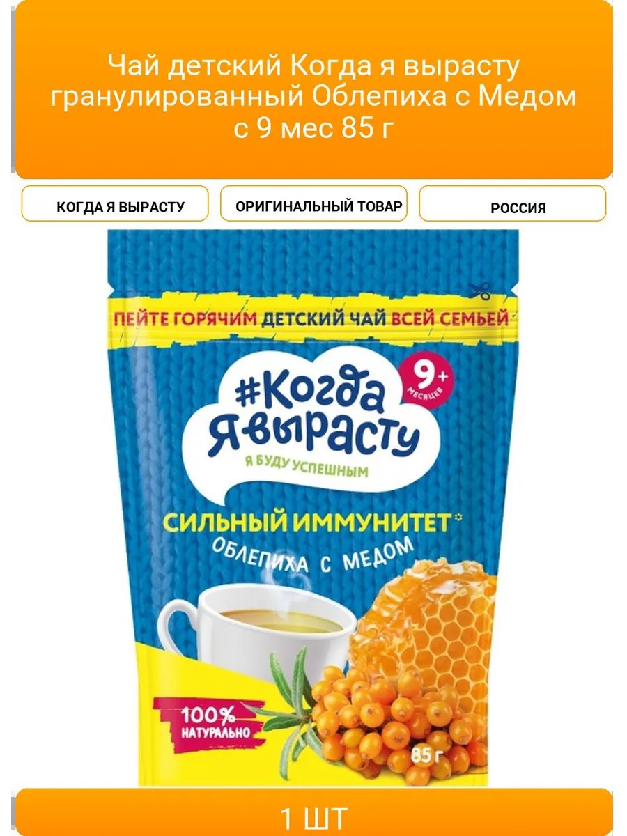 Чай Когда я вырасту - это первый российский бренд, созданный для заботливых мам, выбирающих полезные и безопасные продукты для своих малышей. Гранулированный чай с облепихой и медом разработан специально для детей с 9 месяцев, обеспечивая им вкусный и полезный напиток.