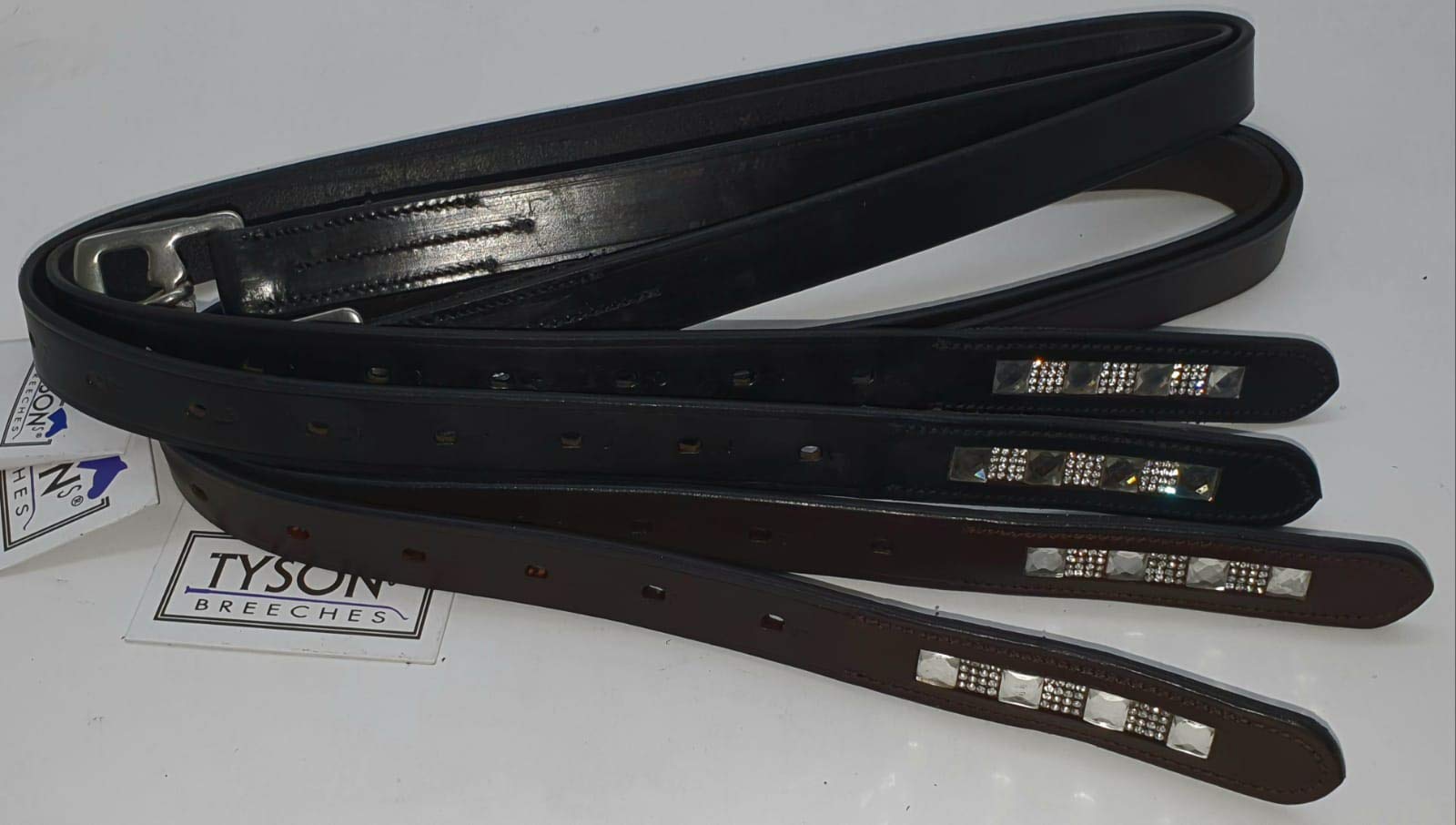 Glitzer , je Seite ~ 7 cm lang. Breite 2 cm ( Standard). Nummeriert Längen 100 110 oder 120 cm. Marke : Tysons Breeches Glitzer / Strass Kristall. Kinder Steigbügelriemen BIG LIZ LEDER.