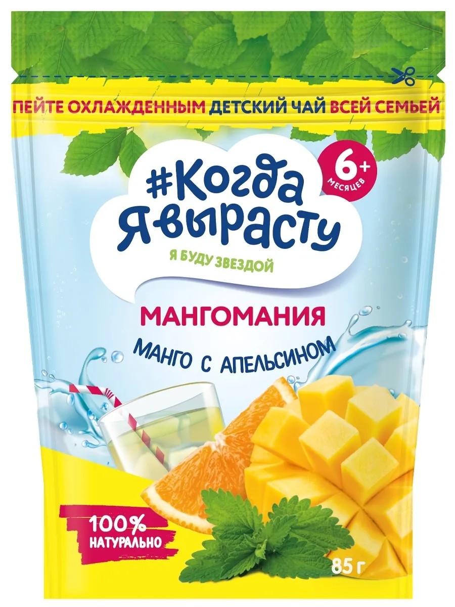 #When I Grow Up - the first Russian brand for caring mothers who choose healthy and safe products for their babies! Mangomania children's tea with mango, orange, and lemon balm is a healthy drink for children over 6 months. This instant tea dissolves perfectly in water and has the rich flavor of sunny mango, juicy orange, and cool mint. It perfectly quenches your thirst in the hot season and reminds you of summer and sunshine in the cold season! Enjoy tea with the whole family! Convenient, airtight packaging (Doypack) preserves the drink's properties throughout the entire consumption period. Affordable price, optimal packaging volume, and high quality are the distinctive features of #When I Grow Up children's tea. The tea is produced at a state-of-the-art factory in compliance with the highest quality standards for baby food.