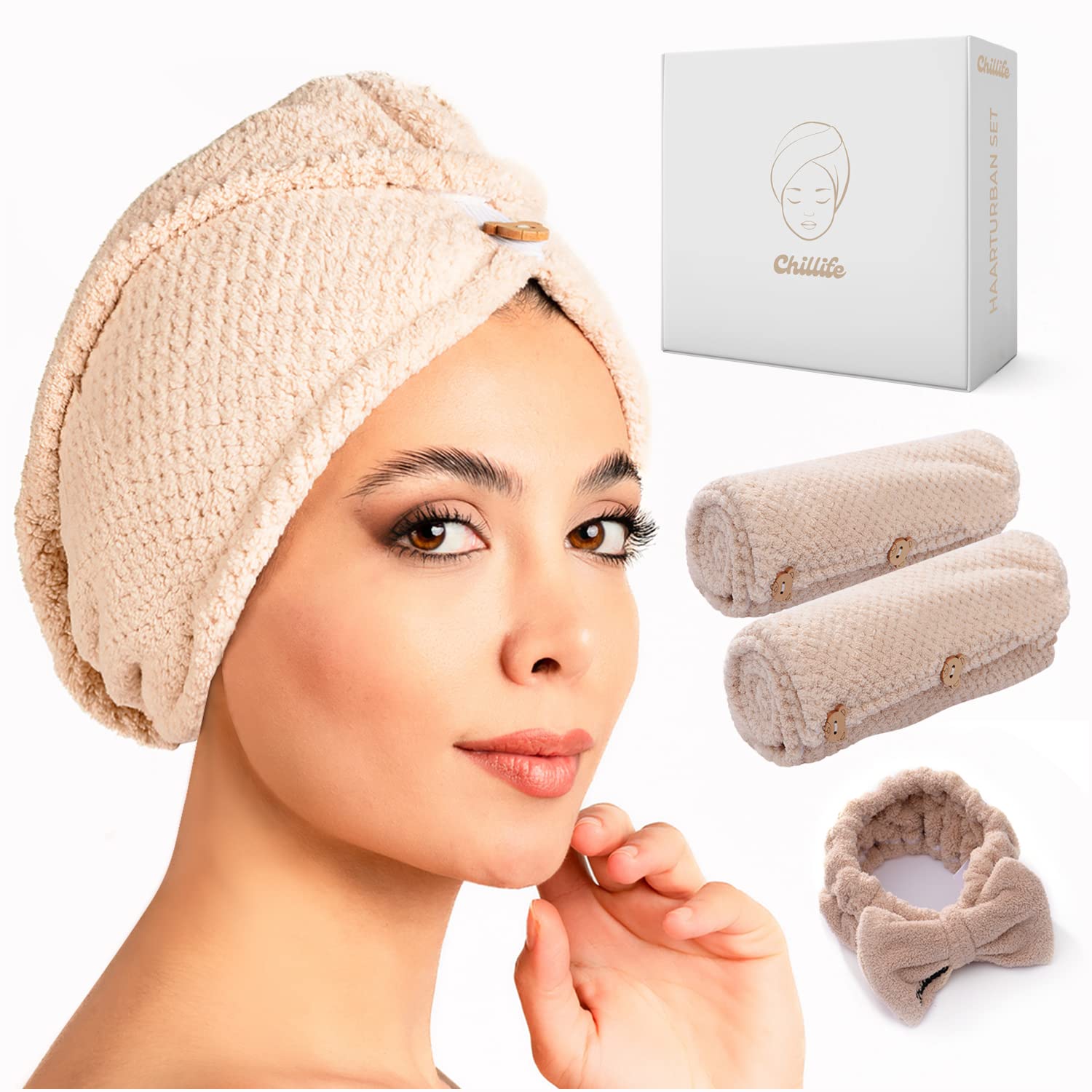 Giving away hair bathing towel set: In addition to self -use, the chillife Haartuch set is also great as a gift.Whether for your sister, your daughter, wife, girlfriend, your grandmother, or your acquaintance, the hair turbane and the hair band will be like and find space in your bathroom.The Microfiber towels offer relaxed comfort after the shower and dry short and long hair quickly and efficiently!.Great set with extras: In addition to the already mentioned hair band, our turban towel with a button for hair is accompanied by a beautiful and practical packaging pocket.The bag can also also be found in other use, there can be, for example, cosmetics make -up, gels, patches and other hygiene accessories and use and take with you as a travel accessories.Button closure for optimal hold: Our chillife Towel Set is equipped with a button in a bear shape and a rubber run.It is not only sweet, but is also practical, so you can easily adapt the size and attach it and the weight loss is super easy.Pull over your head, crank wrap together and make the button tight, see image instructions.Super soft: When processing our Microfiber Towel sets, we always paid attention to comfort and soft materials so that you feel comfortable while wearing.The microfiber towel dries your hair naturally and replaces the hair dryer and hairdryer, you do not use energy at home and on the go.The towel is ideal for the sauna, spa and gym, after swimming or for yoga, even when traveling - the turban keeps long hair together.Quick -drying towel: Do you want an alternative to a hair dryer that has a similar effectiveness and super comfortable, but it does save power, since no socket is required for use and is therefore uncomplicatedWith the chillife head towel, you will make the right choice.The set contains 2 hair turbans and 1 hair band in the color beige, which you can use, for example, after the shower for drying your hair.HAAR BADETUCH SET VERSCHENKEN: Neben dem Selbstgebrauch eignet sich das Chillife Haartuch Set auch super als Geschenk. Ob für Deine Schwester, Deine Tochter, Deine Frau, Deine Freundin, Deine Großmutter, oder Deine Bekannte, die Haarturbane und das Haarband werden ihnen gefallen und Platz in ihrem Badezimmer finden. Die Microfaser Handtücher bieten einen entspannten Komfort nach der Dusche und trocknen schnell und effizient kurze und lange Haare!. TOLLES SET MIT EXTRAS: Neben dem schon erwähnten Haarband, werden unsere Turban Handtuch mit Knopf für Haare von einer schönen und praktischen Verpackungstasche begleitet. Die Tasche kann darüber hinaus auch anderweitigen Einsatz finden, man kann dort zum Beispiel Kosmetik Make Up, Gels, Patches und weiteres Hygienezubehör verstauen und als Reise Zubehör benutzen und mitnehmen. KNOPFVERSCHLUSS FÜR OPTIMALEN HALT: Unser Chillife Towel Set ist mit einem Knopf in Bärchen-Form und einer Gummischlaufe ausgestattet. Es sieht nicht nur süß ist, sondern ist auch praktisch, so kann man die Größe leicht anpassen und das Anbringen und das Abnehmen des Haartuchs fällt einem super einfach. Über den Kopf ziehen, zusammenkurbeln einwickeln und den Knopf fest machen, siehe Bildanleitung. SUPER WEICH: Bei der Verarbeitung unseres microfiber Towel Sets haben wir stets auf Komfort und weiche Materialien geachtet, damit Du Dich beim Tragen bestens wohl fühlst. Das Mikrofaser Handtuch trocknet Dein Haar natürlich und ersetzt den Fön und Haartrockner, Du verbrauchst keine Energie zuhause und unterwegs. Das Handtuch ist optimal geeignet für die Sauna, Spa und Fitnessstudio, nach dem Schwimmen oder fürs Yoga, selbst auf Reisen - der Turban hält langes Haar super zusammen. SCHNELLTROCKNENDES HANDTUCH: Du möchtest eine Alternative zu einem Haartrockner, die eine ähnliche Effektivität aufweist und super komfortabel, dabei jedoch stromsparend, da für die Nutzung keine Steckdose benötigt wird und somit unkompliziert ist, findenMit dem Kopfhandtuch Set von Chillife wirst Du die richtige Wahl treffen. Im Set enthalten sind 2 Haarturbane und 1 Haarband in der Farbe beige, diese kannst Du z.B. nach der Dusche für die Trocknung Deiner Haare verwenden.Chillife Premium Haarturban Set I Kopfhandtuch mit Knopf I Mikrofaser Handtuch Set bestehend aus 2 Microfaser Handtuch und 1 Haarband I Handtuch schnelltrocknend I Turban I verstellbare Größe (Beige)