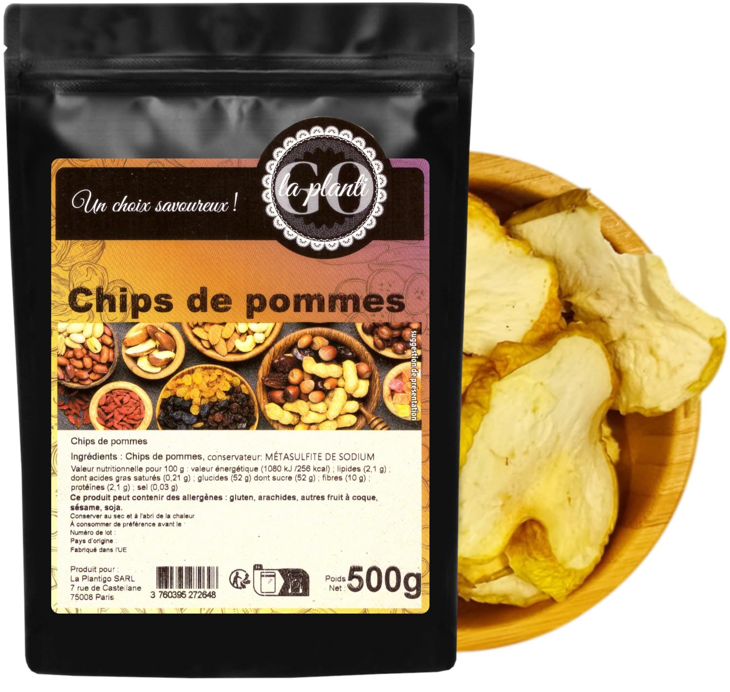 Description du produit Ingrédients : pommes séchées, conservateur : E223- pyrosulfite de sodium. Le produit peut contenir des traces de pépins. Valeurs nutritionnelles pour 100 g: Valeur énergétique –1080 kJ 256 kcal Lipides – 2,1 g Dont acides gras saturés - 0,21 g Glucides – 52 g Dont sucres - 52 g Fibre - 10 g Protéines – 2,1 g Sel – 0,03 g Les valeurs nutritionnelles ont été calculées à partir de base de données et spécifications de matières premières. Les lots individuels peuvent varier légèrement. Information sur allergènes : Ce produit peut contenir les allergènes : gluten, arachides, fruit à coque, sésame, soja. Méthode d'emballage : Le produit est emballé dans des sachets épais de type « doypack ». L'emballage a une fermeture à cordon soudé, ce qui permet l'ouverture et la fermeture facile plusieurs fois. Grâce à cette technologie simple le produit garde sa fraicheur. Ses propriétés organoleptiques ne changent pas pendant toute la durée de conservation. Grâce aux volumes de ventes important et la rotation de nos stocks, les produits LA PLANTIGO sont toujours frais, ce qui favorise les achats en gros et le stockage des aliments dans le garde-manger à la maison. Ingrédients pommes séchées, conservateur : E223- pyrosulfite de sodium. Le produit peut contenir des traces de pépins.
