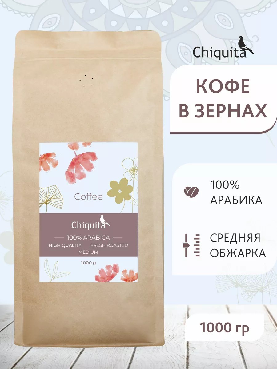 Премиальный кофе в зернах Chiqita – 100% арабика Hight Quality. Свежая средняя обжарка. Объем упаковки - 1 кг.