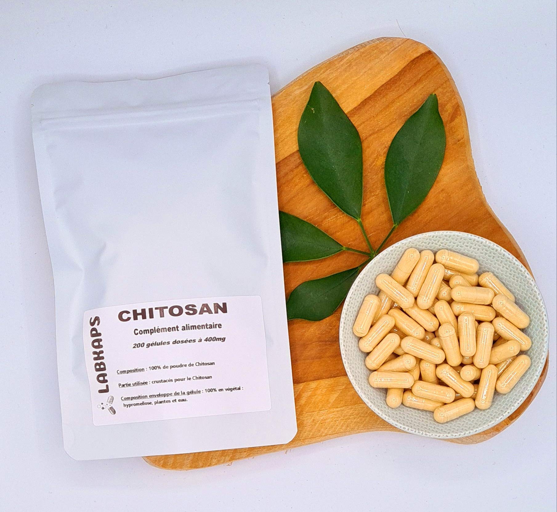 Chitosan is a derivative of chitin, a substance found primarily in crustacean shells. Directions for use: 2 to 4 capsules day to be swallowed with a large glass of water 15 minutes before meals, to be taken as a supplement to a varied and balanced diet. Precautions: Do not exceed the recommended dose. Product not recommended for children under 12 years old. Not recommended for pregnant or breastfeeding women. Keep out of reach of young children, away from heat and humidity. Per 4 capsules: 26000 mg of Chitosan INGREDIENTS 100 Chitosan powder100 plant-based. 100 NATURAL: All ingredients are of natural origin, gluten-free, fructose-free, lactose-free, and GMO-free. VEGAN product. FRENCH QUALITY: We manufacture our food supplements in France. Our goal is to guarantee you the best quality price ratio. We check each batch for the presence of pesticides, bacteria, and heavy metals to offer you a product of impeccable quality at a low price. Le Chitosan est un dérivé de la chitine, une substance que l'on trouve principalement au sein des carapaces de crustacés. Conseils d'utilisation : 2 à 4 gélules jour à avaler avec un grand verre d'eau 15 min avant le repas, à prendre en supplémentation d'une alimentation variée et équilibrée. Précautions à prendre : Ne pas dépasser la dose recommandée. Produit déconseillé aux enfants de moins de 12 ans. Déconseillé aux femmes enceintes ou allaitantes. Tenir hors de la portée des jeunes enfants, à l'abri de la chaleur et de l'humidité. Pour 4 gélules : 26000 mg de Chitosan INGRÉDIENTS 100 de poudre de Chitosan100 d'origine végétale. 100 NATUREL : Tous les ingrédients sont d'origine naturelle, sans gluten, sans fructose, sans lactose et sans OGM. Produit VEGAN. QUALITÉ FRANÇAISE : Nous fabriquons nos compléments alimentaires en France. Notre volonté est de vous garantir le meilleur rapport qualité prix. Nous contrôlons pour chaque lot la présence de pesticides, de bactéries, de métaux lourds pour vous offrir un produit d'une qualité irréprochable à petit prix.