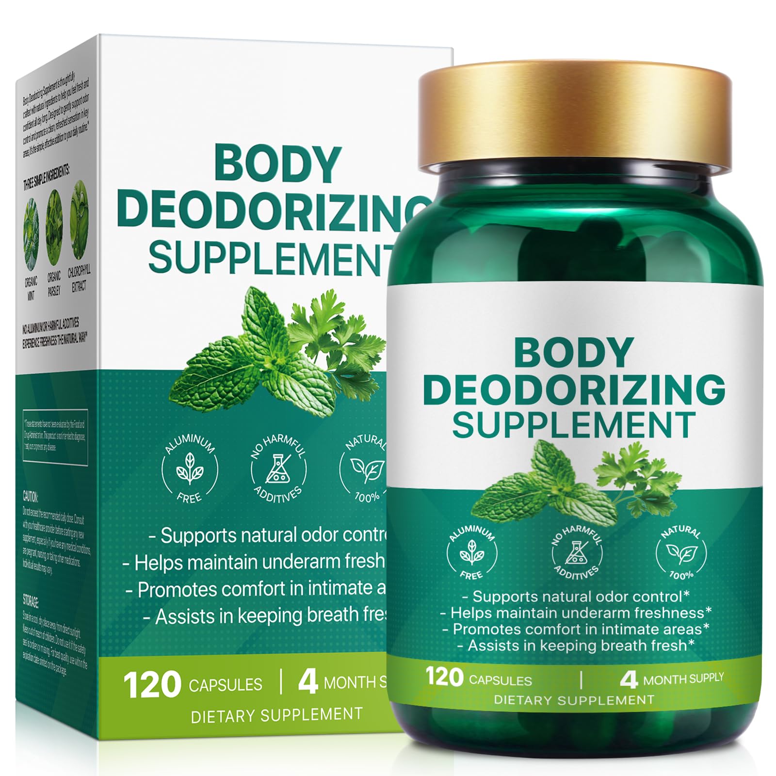 Chlorophyll Body Deodorizing Supplement 120Pcs for Digestion Gut Health Support, Internal Deodorant Capsules for Overall Freshness, Underarms, Intimate Areas, Private Parts, Natural Safe FormulaEasy to Use : one chlorophyll tablet daily to keep odors away. For stronger results, take two body odor pills—one in the morning and one in the evening. Swallow with water or mix into your diet. Vegan, Allergen-Free Formula: Each capsule contains a chlorophyll complex and is free from gluten, soy, dairy, eggs, peanuts, shellfish and gelatin. The formula is non-GMO, cruelty-free, sugar-free. Support GUT, BREATH IMMUNITY : Chlorophyll Full body deodorant supplement supports skin clarity and gut balance. The blend of copper chlorophyllin, parsley, and peppermint works together to enhance health and keep your body feeling naturally fresh. Chlorophyll Capsules for Body Odor: This Body Deodorizing Supplement Supports natural odor control,elps maintain underarm freshness,Promotes comfort in intimate areas,Assists in keeping breath fresh.Natural ingredients to help you feel fresh and confident all day long.Supports natural odor control. Full Body Deodorant Supplement: Our body deodorizing supplement contain chlorophyllin 200mg, parsley leaf 300mg, peppermint 100mg to effectively target body odor, bad breath, and more. This potent formula helps neutralize odors from the inside out, keeping you feeling fresh and confident all day.