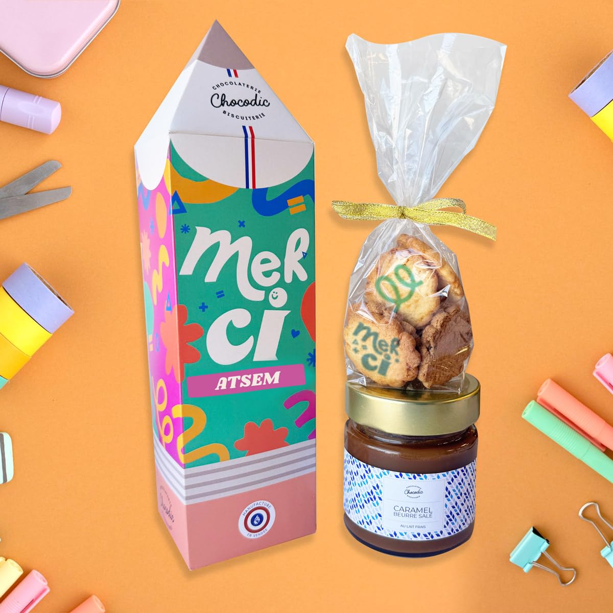 Coffret gourmand caramel et galettes au beurre personnalisées Chocolat Merci Maîtresse Merci Maître Merci Atsem (Version Merci Atsem)