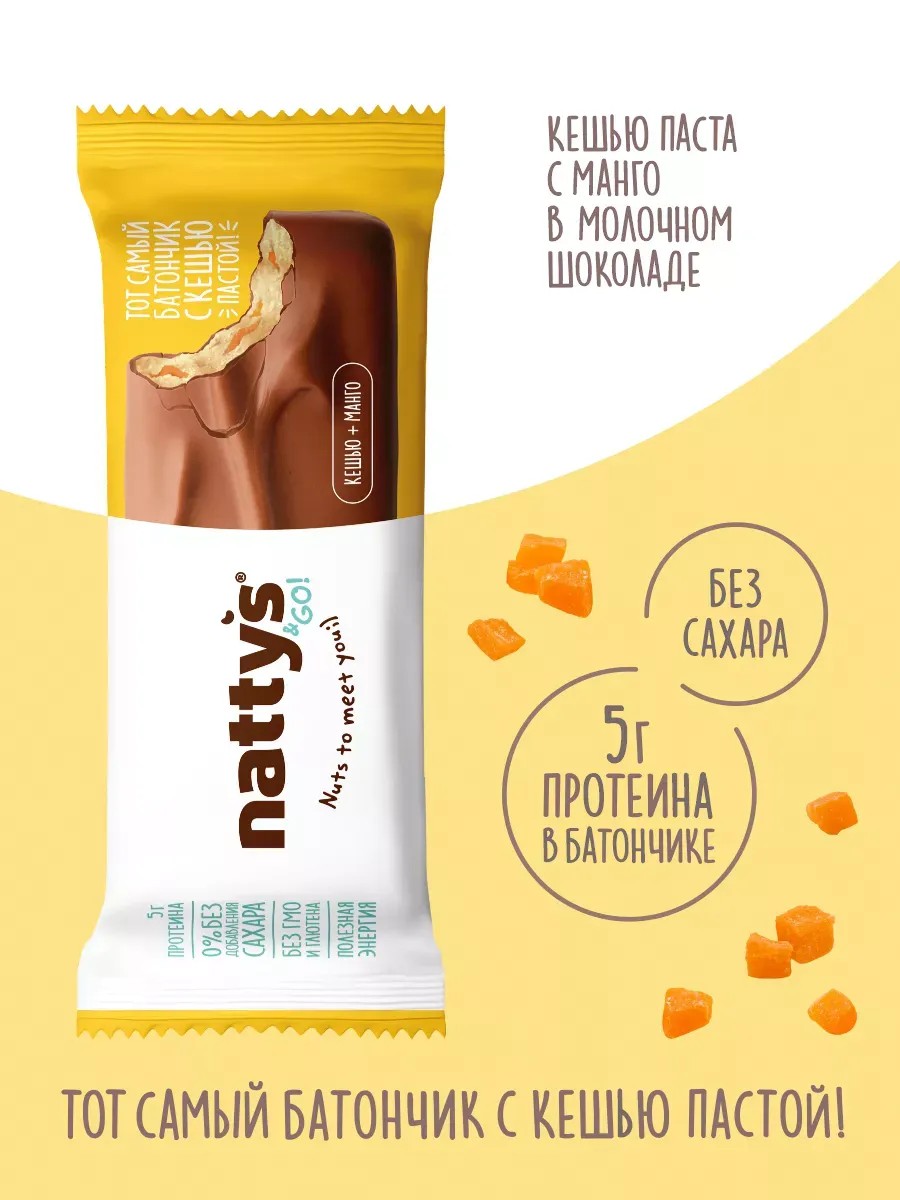 Шоколадные батончики Nattys &Go Mango — это батончики с кешью пастой и кусочками манго внутри, покрытые слоем настоящего молочного шоколада, без добавления сахара, очень вкусные и полезные. Абсолютно натуральный перекус, который доставит много удовольствия и зарядит энергией! Теперь та самая ореховая паста Nattys всегда с собой, в удобной форме батончика to go — это вкусное и легкое лакомство, которое отлично заменяет сладости и идеально подходит для твоего полезного перекуса, без вреда для фигуры и здоровья, без сахара, созданы из премиальных ингредиентов высшего качества, с честным и чистым составом. Nattys &Go — это чистый заряд энергии и насыщение на длительное время. Источник растительного белка и клетчатки.