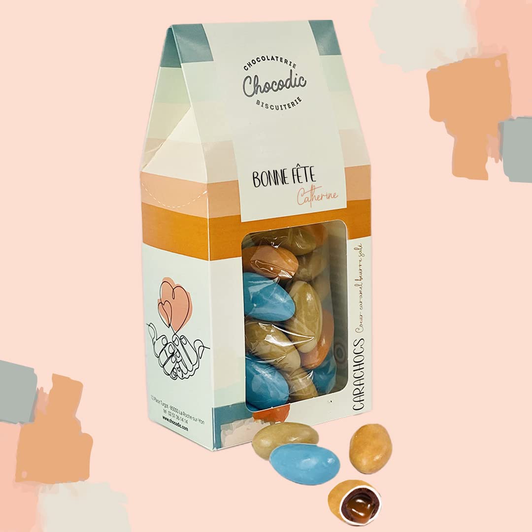 Chocolate couverture 66 cocoa - Cocoa paste - Cocoa butter - Sucrose - Glucose Trimoline - Almond - Hazelnut - Royaltine - Butter - UHT fresh cream - Milk powder - Emulsifier - Soy lecithin - Vanilla flavoringChocodic Master artisan chocolatier for 20 years. Handcrafted in our chocolate factory in Vendée, La Roche-sur-Yon. Personalized cardboard box "MERE VEILLEUSE" - 170g (approximately 25 to 30 candies) 18X7cm format. Delicious chocolate liquicrocs with a runny salted butter caramel center. Couverture chocolat 66 de cacao - Pâte de cacao - Beurre de cacao - Saccharose - Glucose Trimoline - Amande - Noisette - Royaltine - Beurre - Crème fraîche UHT - Poudre de lait - Emulsifiant - Lécithine de soja - Arôme de vanilleChocodic Maître artisan chocolatier depuis 20 ans. Fabriqué de facon artisanale dans notre chocolaterie en vendée à la Roche sur Yon. Ballotin cartonné personnalisé MERE VEILLEUSE - 170g (environ 25 à 30 bonbons) format 18X7cm. De savoureuses liquicrocs au chocolat au coeur coulant caramel au beurre salé.