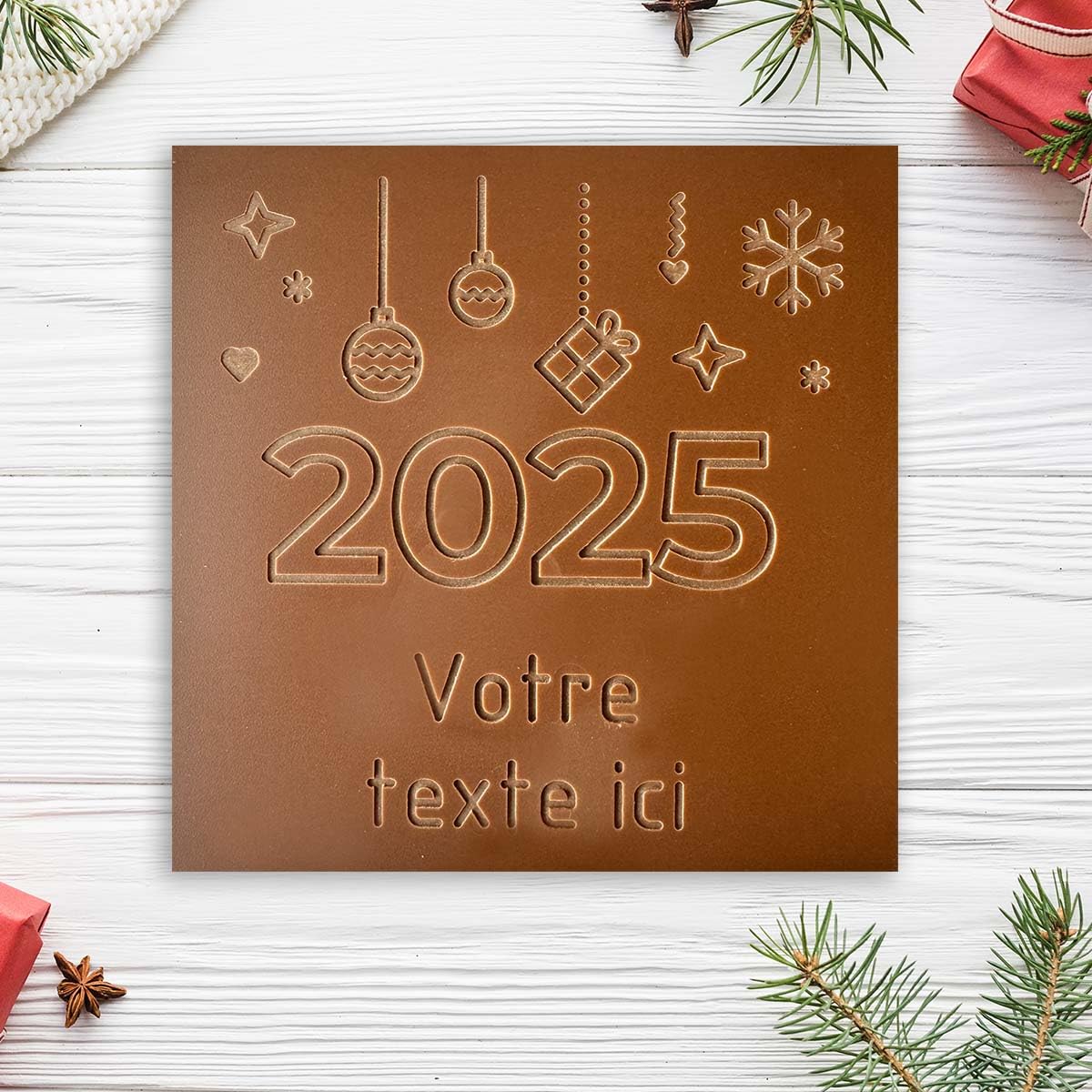A moment to celebrate? A birthday to celebrate? A declaration of love to make? Or simply want to please? Every day offers a unique opportunity to share a Chewable Card! What is a Chewable Card? Imagine a delicious 80g chocolate bar, top of the range, pure cocoa butter. Each tablet is made and engraved with love and passion in our artisanal workshop, located in La Roche-sur-Yon in Vendée. Our unique engraving process allows you to offer a tablet for all occasions. Whether it is a touching message, a delicate pattern or a fun drawing, our team of artisans uses all their know-how to transform chocolate into a true work of edible and 100 natural art. We are proud to offer you chocolates from sustainable agriculture. In fact, 100 of the cocoa beans we use come from crops that respect the environment and producers. So, every bite of our chocolates is not only delicious, but also ethical and responsible. Why choose a Chewable Card? Quality: Our chocolates are made from the best cocoa beans, guaranteeing you an unforgettable taste experience. Craftsmanship: Each tablet is the result of meticulous work carried out in our Vendée workshop, guaranteeing an authentic and handmade product. Sustainability: By choosing our chocolates, you support sustainable and fair agriculture. Offer a Chewable Card for all occasions: Birthdays: Make this event a memorable moment with a tablet engraved especially for the lucky one. Weddings and engagements: Personalize your guest gifts with thank you messages or symbolic designs. Valentine's Day: Declare your love with a declaration engraved on high quality chocolate. Births: Celebrate the arrival of a newborn with a sweet welcome message or congratulate new parents. Just for fun: Because there's never a bad time to offer a little sweetness! Want to share a Chewable Card? Tablet size 10x10cm Weight 80g Arranged in a pretty cardboard box 100 recyclable Milk chocolate flavor INGREDIENTS chocolateWant to share a Carte à Croquer? Tablet size 10x10cm Weight 80g Arranged in a pretty 100 recyclable milk chocolate cardboard box. Offer a Carte à Croquer for all occasions: Birthdays: Make this event a memorable moment with a tablet engraved especially for the lucky one. Weddings and engagements: Personalize your guest gifts with thank you messages or symbolic designs. Valentine's Day: Declare your love with a declaration engraved on a high-quality chocolate. Births: Celebrate the arrival of a newborn with a sweet welcome message or congratulate the new parents. Just for fun: Because there's never a bad time to offer a little sweetness!. Why choose a Carte à Croquer? Quality: Our chocolates are made from the best cocoa beans, guaranteeing you an unforgettable taste experience. Craftsmanship: Each bar is the result of meticulous work carried out in our Vendée workshop, guaranteeing an authentic and handmade product. Sustainability: By choosing our chocolates, you support sustainable and fair agriculture. We are proud to offer you chocolates from sustainable agriculture. Indeed, 100 of the cocoa beans we use come from crops that respect the environment and producers. This means that every bite of our chocolates is not only delicious, but also ethical and responsible. Our unique engraving process allows you to offer a bar for all occasions. Whether it's a touching message, a delicate pattern, or a fun design, our team of artisans uses all their know-how to transform chocolate into a true edible and 100 natural work of art. What is a Carte à Croquer? Imagine a delicious 80g chocolate bar, high-end, pure cocoa butter. Each tablet is made and engraved WITH YOUR TEXT, with love and passion in our artisanal workshop, located in La Roche-sur-Yon in Vendée. To personalize your crunchy card it's simple. just click on the yellow button "PERSONALIZE NOW" and enter your text. You will have a control preview. A moment to celebrate? A birthday to celebrate? A declaration of love to make? Or simply want to please? Every day offers a unique opportunity to share a crunchy card! Personalize your chocolate card with YOUR TEXT. Un moment à célébrer ? Un anniversaire à fêter ? Une déclaration d'amour à faire ? Ou tout simplement envie de faire plaisir ? Chaque jour offre une occasion unique de partager une Carte à Croquer ! Qu'est-ce qu'une Carte à Croquer ? Imaginez une délicieuse tablette de chocolat de 80g, haut de gamme, pur beurre de cacao. Chaque tablette est fabriquée et gravée avec amour et passion dans notre atelier artisanal, situé à La Roche-sur-Yon en Vendée. Notre procédé de gravure unique vous permet d'offrir une tablette pour toutes les occasions. Que ce soit un message touchant, un motif délicat ou un dessin amusant, notre équipe d'artisans met tout son savoir-faire pour transformer le chocolat en une véritable œuvre d'art comestible et 100 naturelle. Nous sommes fiers de vous offrir des chocolats issus d'une agriculture durable. En effet, 100 des fèves de cacao que nous utilisons proviennent de cultures respectueuses de l'environnement et des producteurs. Ainsi, chaque bouchée de nos chocolats est non seulement délicieuse, mais aussi éthique et responsable. Pourquoi choisir une Carte à Croquer ? Qualité : Nos chocolats sont fabriqués à partir des meilleures fèves de cacao, vous garantissant une expérience gustative inoubliable. Artisanat : Chaque tablette est le fruit d'un travail minutieux réalisé dans notre atelier vendéen, garantissant un produit authentique et fait main. Durabilité : En choisissant nos chocolats, vous soutenez une agriculture durable et équitable. Offrez une Carte à Croquer pour toutes les occasions : Anniversaires : Faites de cet événement un moment mémorable avec une tablette gravée spécialement pour l'heureux(se) élu(e). Mariages et fiançailles : Personnalisez vos cadeaux d'invités avec des messages de remerciement ou des motifs symboliques. Saint-Valentin : Déclarez votre flamme avec une déclaration gravé