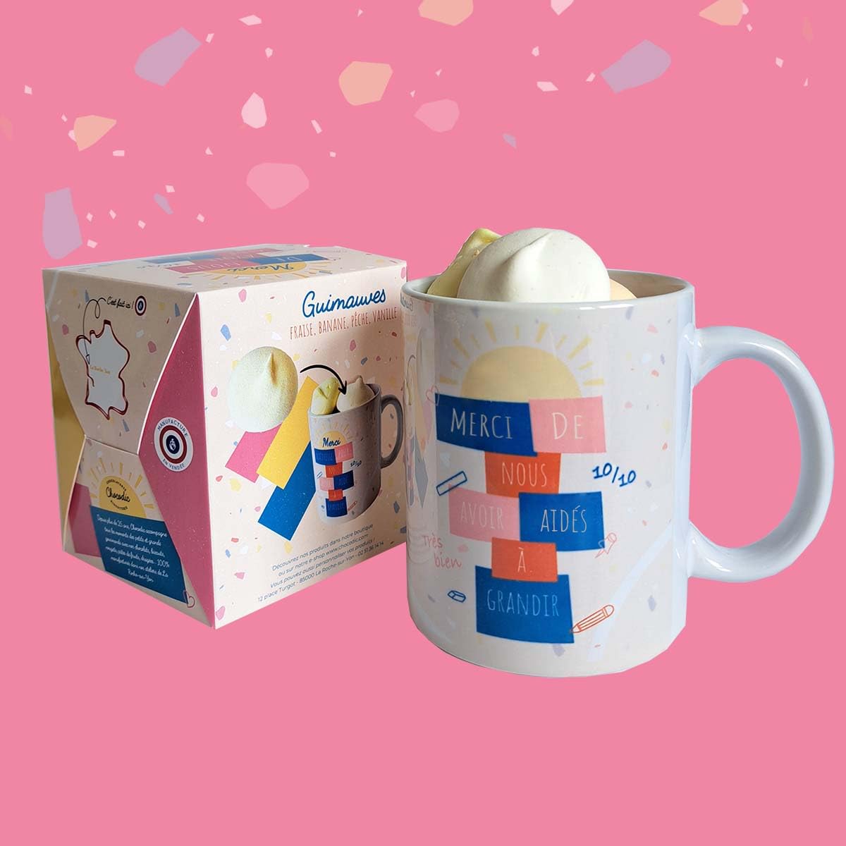 Chocolate couverture 66 cocoa - Cocoa paste - Cocoa butter - Sucrose - Glucose Trimoline - Almond - Hazelnut - Royaltine - Butter - UHT fresh cream - Milk powder - Emulsifier - Soy lecithin - Vanilla flavoringChocodic gift box ready to offer Master artisan chocolatier for 20 years. Handcrafted in our chocolate factory in Vendée at La Roche sur Yon. Size 9.5x8x8cm 325ml in glossy white ceramic - An original, gourmet and HANDCRAFTED gift. A personalized ceramic mug "Thank you for this school year" containing 50G of delicious 100 handmade homemade marshmallows Personalized cardboard box THANK YOU TEACHER. Couverture chocolat 66 de cacao - Pâte de cacao - Beurre de cacao - Saccharose - Glucose Trimoline - Amande - Noisette - Royaltine - Beurre - Crème fraîche UHT - Poudre de lait - Emulsifiant - Lécithine de soja - Arôme de vanillecoffret prêt à offrir Chocodic Maître artisan chocolatier depuis 20 ans. Fabriqué de facon artisanale dans notre chocolaterie en vendée à la Roche sur Yon. Format 9.5x8x8cm 325ml en céramique blanc brillant - Un cadeau original, gourmand et de FABRICATION ARTISANALE. Un mug en céramique personnalisé "Merci pour cette année scolaire" contenant 50G de délicieuses guimauves maison 100 artisanale Coffret cartonné personnalisé MERCI MAITRESSE.