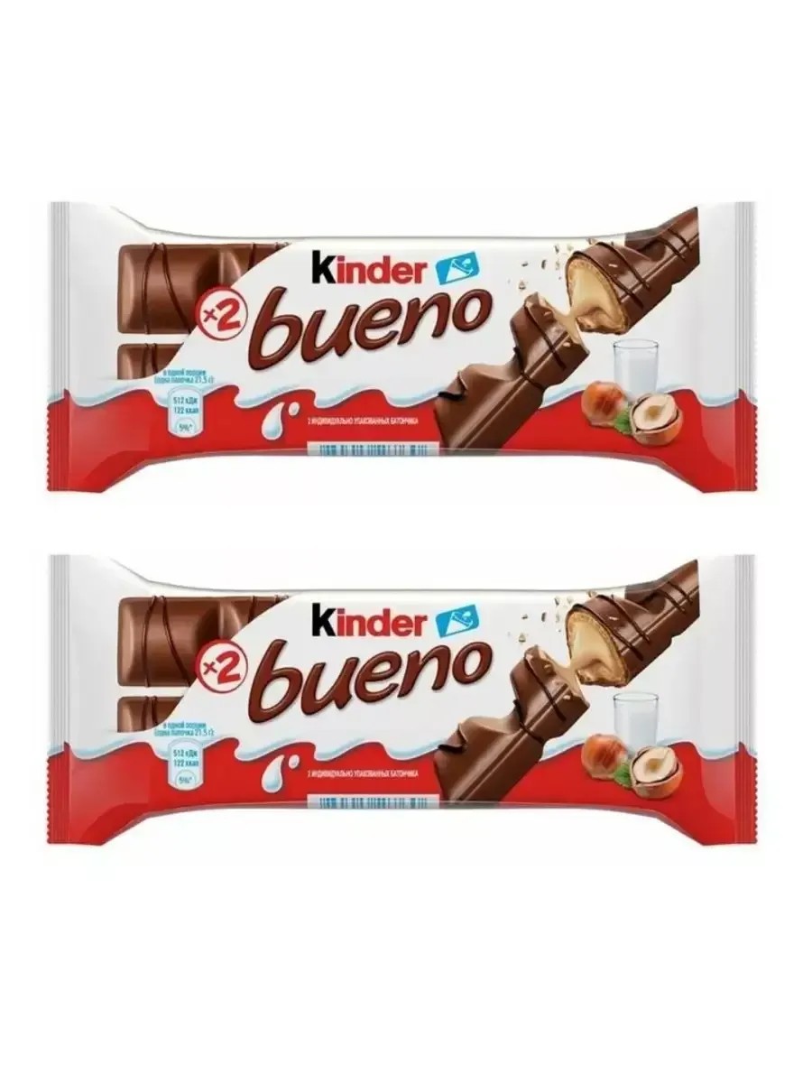 Kinder Bueno Wafer Bar. Set of 2. Total weight: 86 g. These are fresh, crispy wafers covered in milk chocolate with a delicate milky-nut filling. The light Kinder Bueno wafer bar offers an unusual combination of flavors and textures: melting milk chocolate, a light, crispy wafer, and a delicate nut cream that melts in your mouth. Two individually wrapped Kinder Bueno chocolate wafer bars boast a delicious taste thanks to Kinder milk chocolate and an original nut filling. Kinder Bueno bars are great as a snack or a tasty dessert with tea or coffee, and the large packaging makes them perfect as a sweet gift. Original Kinder Bueno wafers contain no low-quality ingredients. We take product quality very seriously.