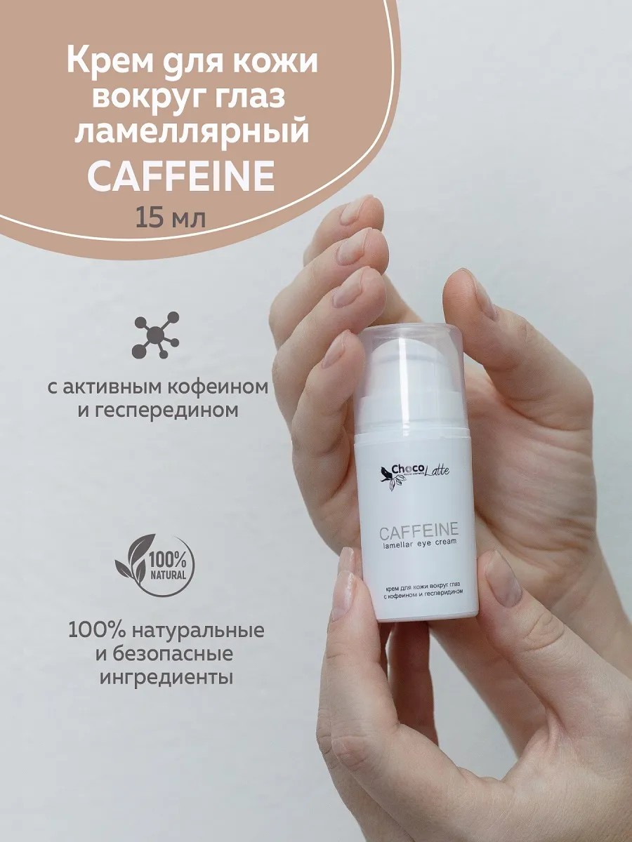 Натуральный ламеллярный крем для век CAFFEINE от ТМ Шоколатте с активным кофеином и гесперидином oбеспечивает комплексный уход за кожей вокруг глаз — питает, увлажняет и подтягивает кожу.