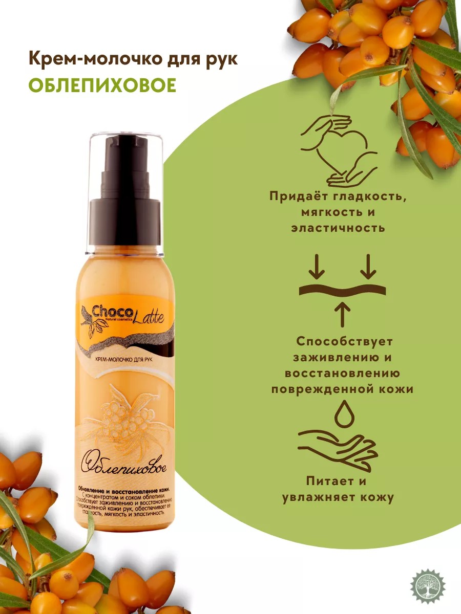 Крeм-МОЛOЧКО для рук ОБЛЕПИХОВОЕ серии ChocоLatte. Нежный уход для поврежденной и сухой кожи рук. Обновление, восстановление и регенерация кожи. Крeм - МОЛОЧКО для рук - это самый простой и в тоже время приятный и необходимый уход за кожей рук. Натуральная эмульсия, стабилизированная воском, природными полисахаридами, на основе натурального меда, с маслами, витаминами и экстрактами, с соком и концентратом облепихи, обладающими регенерирующим, увлажняющим и питательными свойством способствует быстрому заживлению и восстановлению поврежденной кожи рук, придаёт гладкость, мягкость и эластичность. Применение: небольшое количество крема нанесите на кожу массажными движениями до полного впитывания. Хранить в тёмном, прохладном месте.