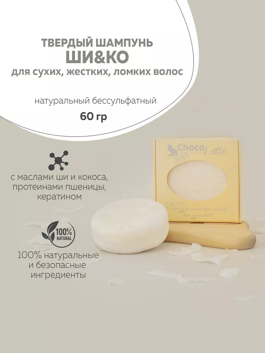 Натуральный твердый шампунь «ШИ&КО» ТМ Шоколатте для мытья сухих, жестких, склонных к ломкости волос.
