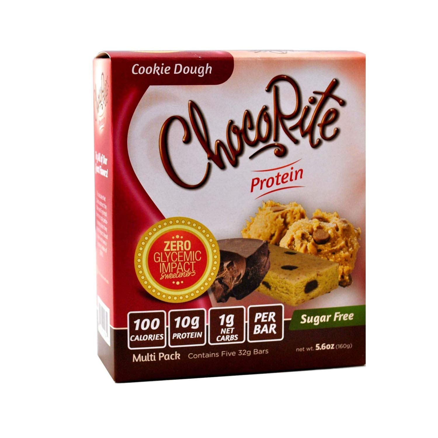 CONTENTS — Each box contains 5 x 32g ChocoRite Protein Bars in Cookie Dough Flavor. HEALTHY SNACK — Delightful snack bar suitable for different types of low-carb and sugar-free diets. SATISFIES CRAVINGS LESS THE GUILT — Gluten and Maltitol-Free. One bar contains 100 Calories, 10g Protein, and 1g Net Carbs. INGREDIENTS — Protein Blend (Whey Protein Isolate, Whey Protein Concentrate), Isomalto-Oligosaccharides (Probiotic Fiber), Almonds, Unsweetened Chocolate, Erythritol, Inulin, Cocoa Butter, Soy Lecithin, Natural Flavors, Stevia, Sucralose. SUGAR-FREE PROTEIN BAR — ChocoRite is the leader in zero glycemic impact sweeteners that's why it's one of the health-conscious consumers' choices.