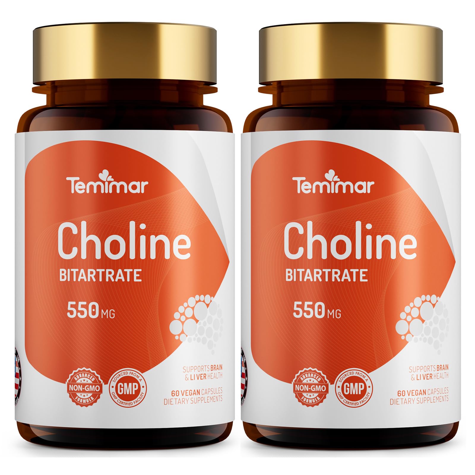 Choline Supplements, Supports Liver & Brain Health, High Absorption Choline Bitartrate 550mg, Non-GMO, Gluten-Free, Made in USA, 120 Vegan Capsules 60 Count (Pack of 2) Choline Bitartrate