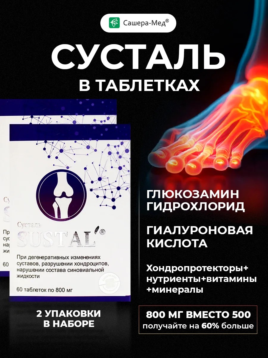 Препарат сусталь от компании сашера-мед предназначен для обезболивания, восстановления, укрепления и поддержания здоровья суставов и связок. Этот комплекс создан на основе натуральных хондропротекторов и экстрактов множества полезных трав. В состав таблеток входит морской коллаген, глюкозамина гидрохлорид, гиалуроновая кислота, хондроитин, сабельник, алтайское мумие, а также витамины В, С, Е, D3 и разные микроэлементы. Средство улучшает кровоснабжение и обмен веществ в суставах, питает их, снимает отечность, боль и воспаление, способствует восстановлению подвижности и предотвращению разрушения хрящевой ткани. Также оно повышает плотность костной ткани, предотвращает рост костных шипов и улучшает состояние синовиальной жидкости, облегчая движение суставов.