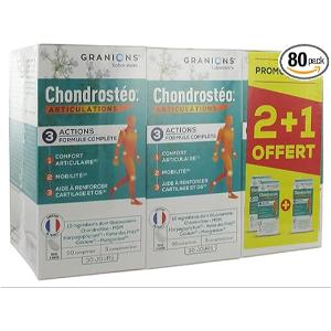 INGREDIENTS: Glucosamine HCL, minerals: calcium carbonate (corn starch) - tricalcium phosphate - copper gluconate - manganese gluconate, methylsulfonylmethane (MSM), chondroitin sulfate sodium, harpagophytum extract (Harpagophytum procumbens, maltodextrin), meadowsweet (Spiraea ulmaria), blackcurrant (Ribes nigrum), bamboo extract (Bambusa arundinacea), anti-caking agent: magnesium stearate, emulsifiers: mono, di and tri-glycerides of fatty acids. COATING INGREDIENTS: Hydroxypropylmethylcellulose, microcrystalline cellulose, stearic acid. INGREDIENTS INGREDIENTS: Glucosamine HCL, minerals: calcium carbonate (corn starch) - tricalcium phosphate - copper gluconate - manganese gluconate, methylsulfonylmethane (MSM), chondroitin sulfate sodium, harpagophytum extract (Harpagophytum procumbens, maltodextrin), meadowsweet (Spiraea ulmaria), blackcurrant (Ribes nigrum), bamboo extract (Bambusa arundinacea), anti-caking agent: magnesium stearate, emulsifiers: mono, di and tri-glycerides of fatty acids. COATING INGREDIENTS: Hydroxypropylmethylcellulose, microcrystalline cellulose, stearic acid. DIRECTIONS FOR USE DIRECTIONS FOR USE: 3 tablets in 1 dose with a large glass of water, preferably in the morning during breakfast. To be used in a 3-month program and to be renewed if necessary. Store away from heat and humidity. SAFETY WARNING The consumption of this food supplement is not recommended for people with diabetes or pre-diabetes, asthmatics, treated with anti-vitamin K to people with a food allergy to shellfish or insects to people whose diet is controlled for sodium, potassium or calcium because these supplements can be an important source. This product is not recommended for pregnant or breastfeeding women and children under 18 years of age. Reserved for adults. The Granions laboratory has been an expert in natural health and Oligotherapy since 1948. Recommended by more than 6,000 doctors, the products from the Granions laboratory are available in more than 15,000 pharmacies in France. Made in France. TRIPLE ACTION FORMULA: mobility, flexibility and bone capital to promote your daily joint well-being. MINERALS AND TRACE ELEMENTS: Calcium and Manganese contributing to the maintenance of bone capital, Bamboo extract titrated in silicon, Copper contributing to the maintenance of connective tissues. PLANTS WITH RECOGNIZED VIRTUES: Harpagophytum traditionally used to promote joint comfort, Blackcurrant leaves and Meadowsweet helping to improve joint mobility. NATURALLY OCCURING CONSTITUENTS IN CARTILAGE: Glucosamine HCL dosed at 1125 mg, Chondroitin sulfate sodium dosed at 150 mg, Methyl-Sulfonyl-Methane (MSM) containing Sulfur. A FOOD SUPPLEMENT dedicated to joints, CHONDROSTEO JOINTS is a triple-action formula, intended for recurring episodes of mild to moderate discomfort. INGRÉDIENTS : Glucosamine HCL, minéraux : carbonate de calcium (amidon de maïs) - phosphate tricalcique - gluconate de cuivre - gluconate de manganèse, méthylsulfonylméthane (MSM), chondroïtine sulfate sodique, extrait d'harpagophytum (Harpagophytum procumbens, maltodextrine), reine des près (Spiraea ulmaria), cassis (Ribes nigrum), extrait de bambou (Bambusa arundinacea), anti-agglomérant : stéarate de magnésium, émulsifiants : mono, di et tri-glycérides d'acides gras. INGRÉDIENTS D'ENROBAGE : Hydroxypropylméthylcellulose, cellulose microcristalline, acide stéarique. INGRÉDIENTS INGRÉDIENTS : Glucosamine HCL, minéraux : carbonate de calcium (amidon de maïs) - phosphate tricalcique - gluconate de cuivre - gluconate de manganèse, méthylsulfonylméthane (MSM), chondroïtine sulfate sodique, extrait d'harpagophytum (Harpagophytum procumbens, maltodextrine), reine des près (Spiraea ulmaria), cassis (Ribes nigrum), extrait de bambou (Bambusa arundinacea), anti-agglomérant : stéarate de magnésium, émulsifiants : mono, di et tri-glycérides d'acides gras. INGRÉDIENTS D'ENROBAGE : Hydroxypropylméthylcellulose, cellulose microcristalline, acide stéarique. MODE D'EMPLOI CONSEILS D'UTILISATION: 3 comprimés en 1 prise avec un grand verre d'eau de préférence le matin au cours du petit déjeuner. À utiliser en programme de 3 mois et à renouveler si nécessaire. À conserver à l'abri de la chaleur et de l'humidité. AVERTISSEMENT DE SÛRETÉ La consommation de ce complément alimentaire est déconseillée aux personnes diabétiques ou pré-diabétiques, asthmatiques, traitées par anti-vitamine K aux personnes présentant une allergie alimentaire aux crustacés ou aux insectes aux personnes dont l'alimentation est contrôlée pour le sodium, le potassium ou le calcium car ces compléments peuvent en être une source importante. Ce produit est déconseillé chez la femme enceinte ou allaitante et aux enfants de moins de 18 ans. Réservé à l'adulte. Le laboratoire des Granions est expert en santé naturelle et Oligothérapie depuis 1948. Conseillé par plus de 6000 médecins, les produits du laboratoire des Granions sont présents dans plus de 15000 pharmacies en France Fabriqué en France. FORMULE TRIPLE ACTION : mobilité, souplesse et capital osseux pour favoriser votre bien-être articulaire au quotidien. DES MINÉRAUX ET DES OLIGOÉLÉMENTS : le Calcium et le Manganèse contribuant au maintien du capital osseux, l'extrait de Bambou titré en silicium, le Cuivre contribuant au maintien des tissus conjonctifs. DES PLANTES DONT LES VERTUS SONT RECONNUES : l'Harpagophytum traditionnellement utilisé pour favoriser le confort articulaire, les feuilles de Cassis et la Reine des Prés contribuant à améliorer la mobilité articulaire. DES CONSTITUANTS NATURELLEMENT PRÉSENTS DANS LE CARTILAGE : la Glucosamine HCL dosée à 1125 mg, la Chondroïtine sulfate sodique dosée à 150mg, le Méthyl-Sulfonyl-Méthane (MSM) contenant du Soufre. COMPLEMENT ALIMENTAIRE dédié aux articulations, CHONDROSTEO ARTICULATIONS est une formule triple action, destinée aux épisodes d'inconforts légers à modérés récur