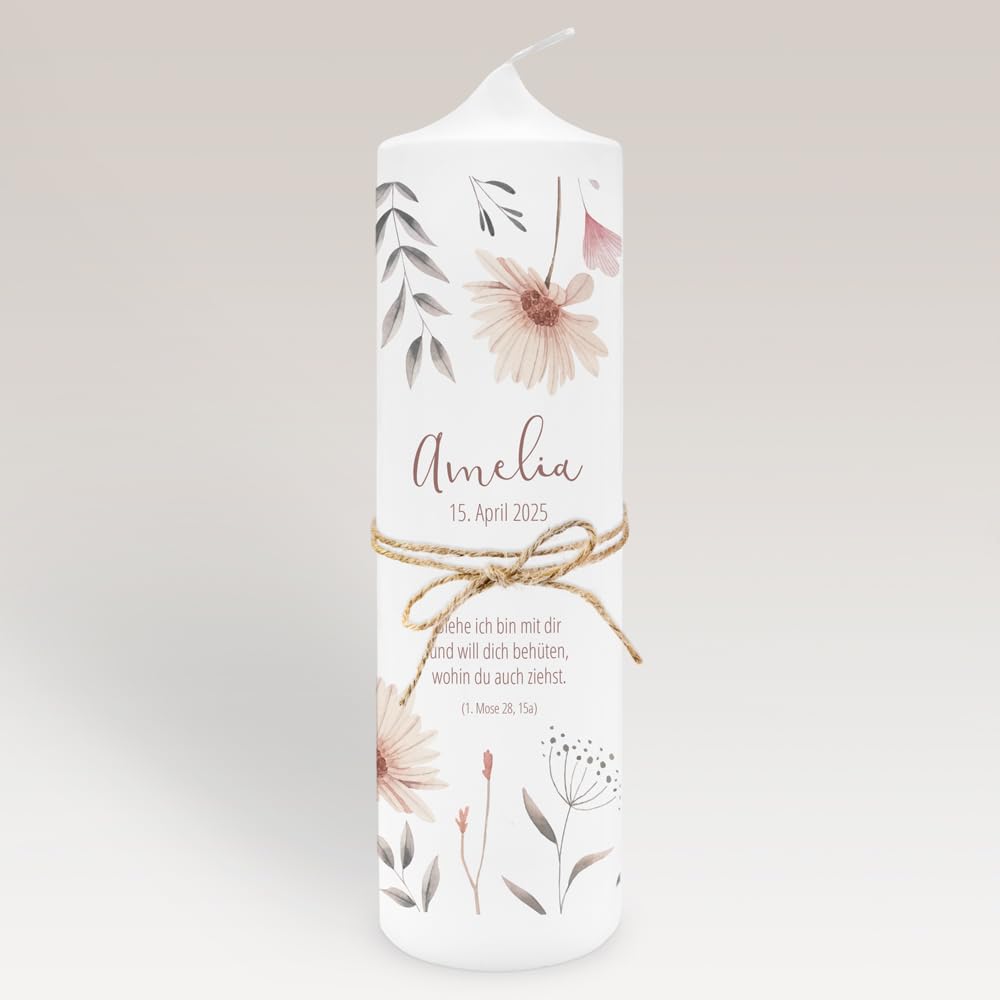 Taufkerze Mädchen Blumen modern personalisiert mit Namen & Taufspruch, online selbstgestalten, inkl. Jutebandverzierung